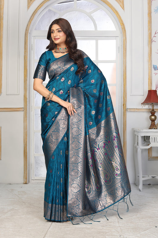 Peacock Blue Jacquard Silk Saree with Silver Zari & Multicolor Floral Buttas