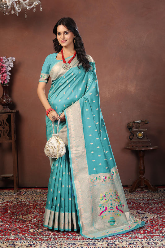 Turquoise Blue Paithani Silk Saree with Silver Zari and Multicolor Peacock Pallu
