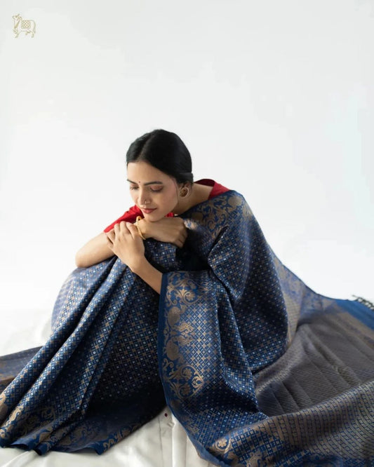 Elegant Navy Blue Banarasi Soft Silk Saree with Golden Zari Weaving