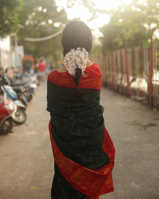 Sindoor Elegance Banarasi Soft Silk Saree with Red & Bottle Green Contrast Weaving