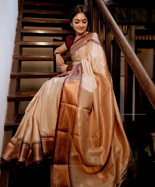 Cream and Maroon Banarasi Soft Silk Saree with Checked Zari Weaving and Contrast Border