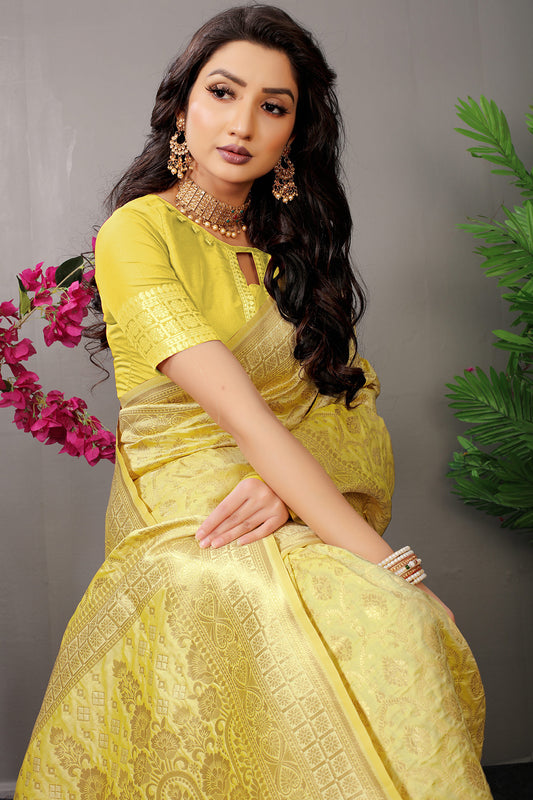 Elegant Pastel Yellow Banarasi Jacquard Silk Saree with Subtle Gold Zari Weaving