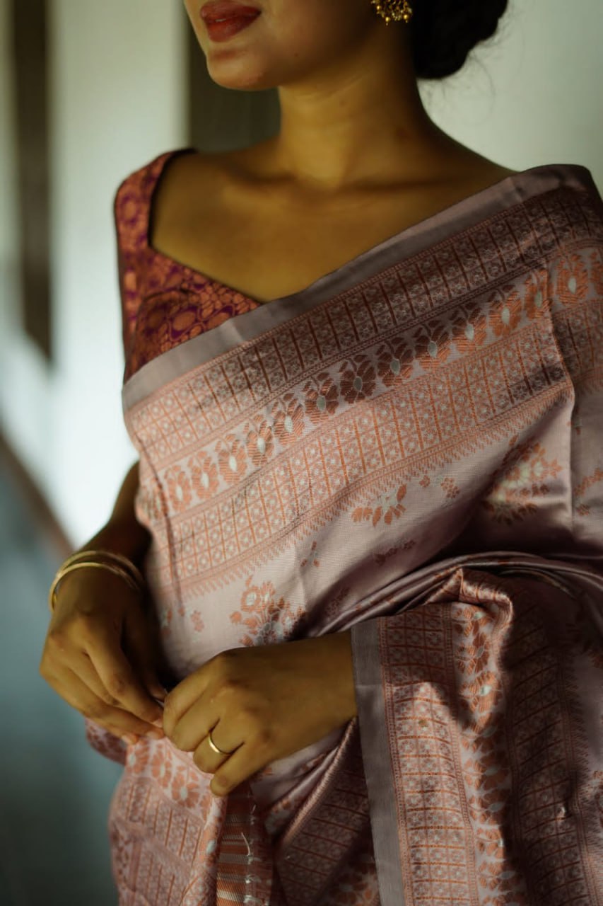 • Design: Copper Zari Weaving with Floral & Geometric Motifs