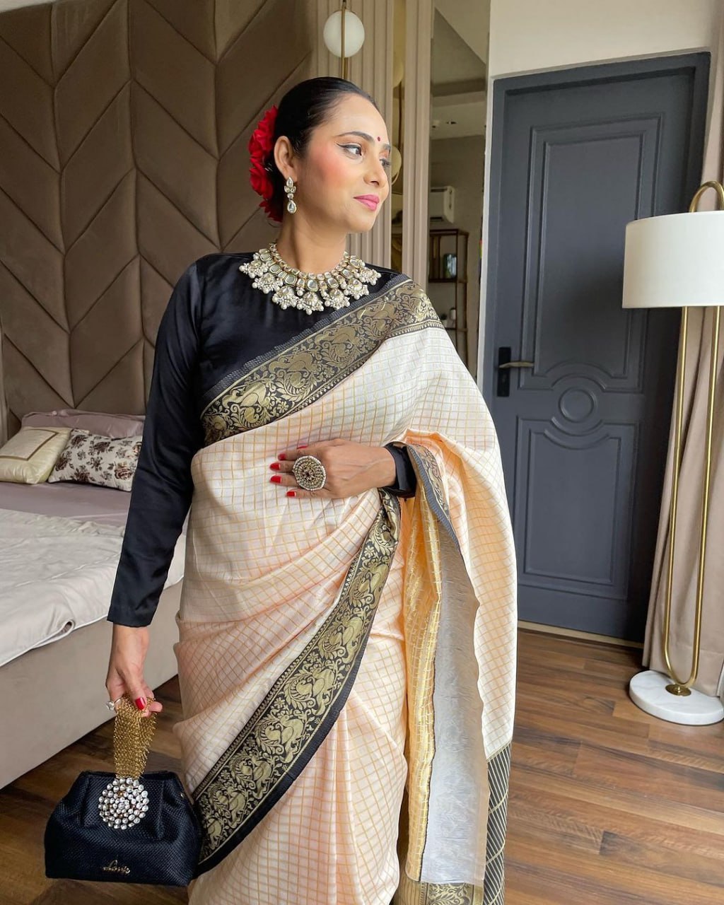 just purchased Banarasi Soft Silk Saree with Checkered Design & Rich Black Zari Border