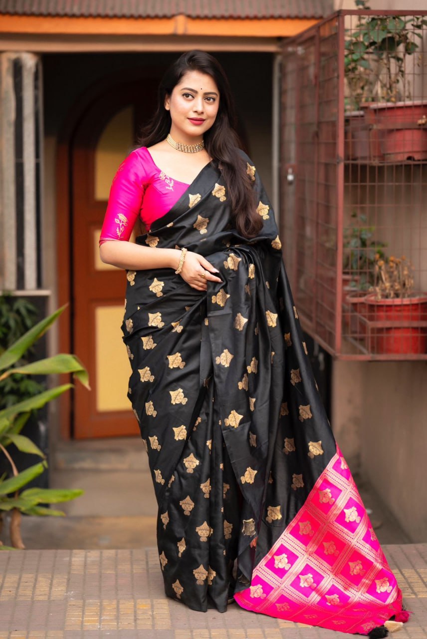 Black Banarasi Soft Silk Saree with Dual-Tone Contrast Pallu & Golden Zari Butta