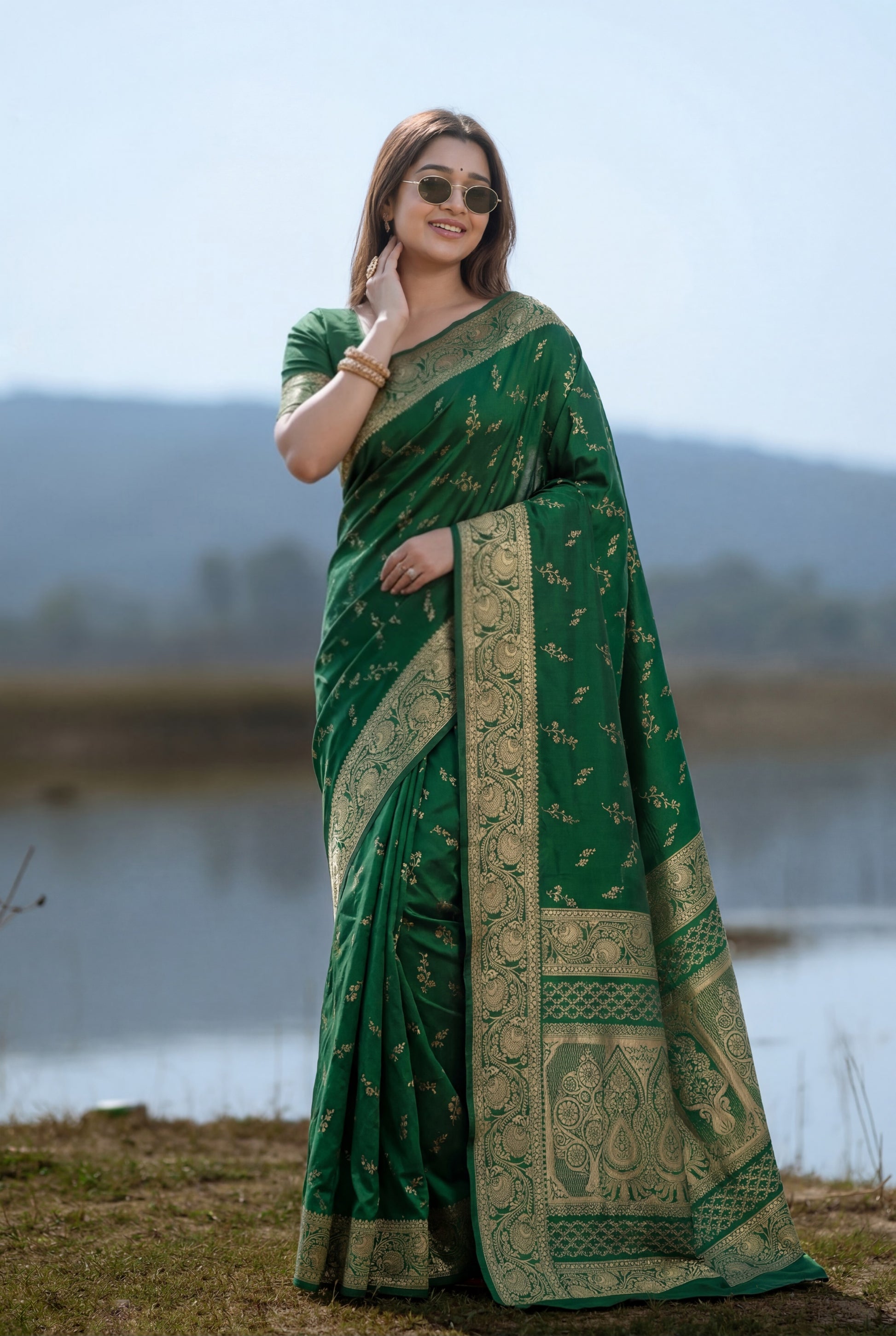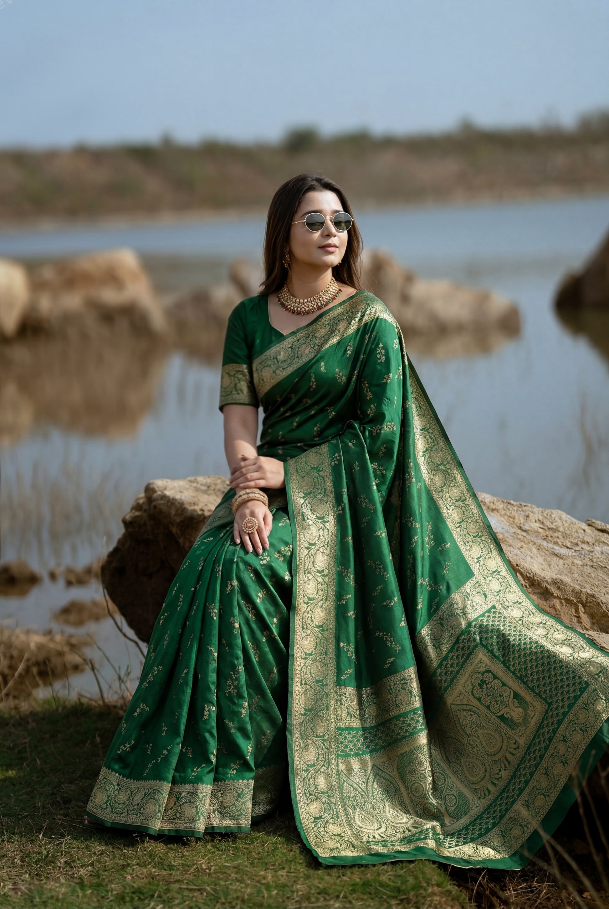 Bottle Green Banarasi Silk Saree with Intricate Zari Border and Pallu