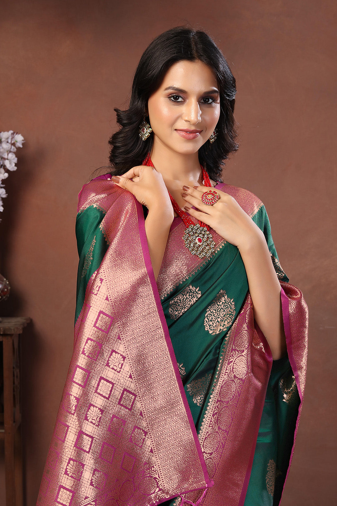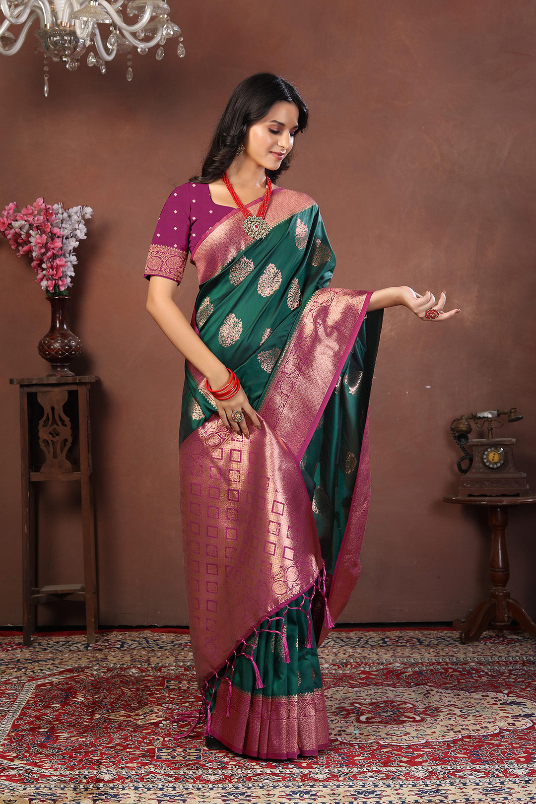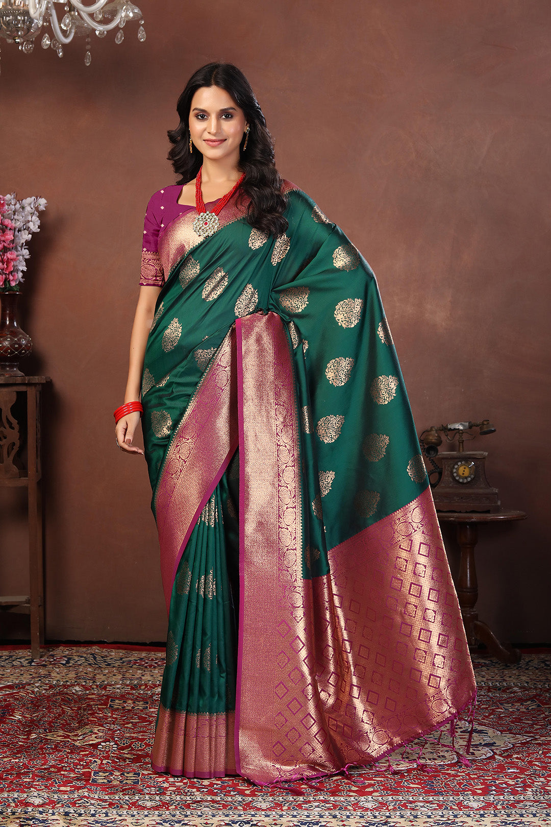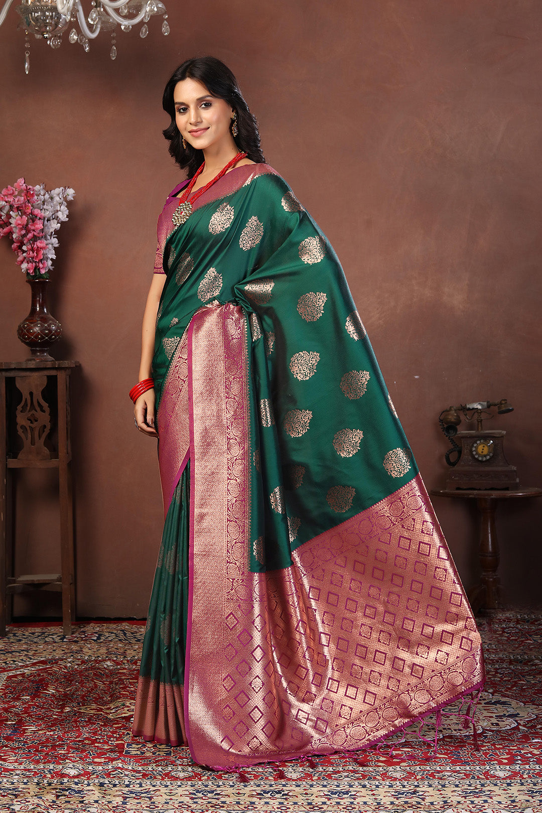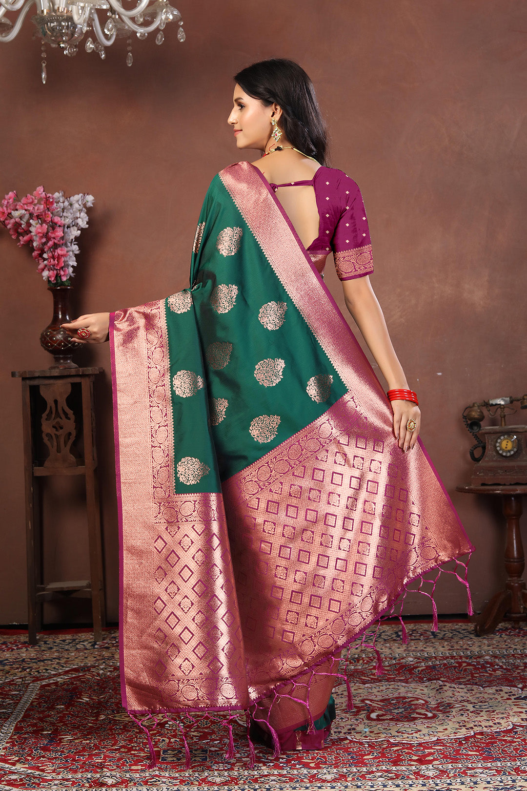 tep into the spotlight with this striking bottle green jacquard silk saree, exquisitely woven with round antique gold buttas and a bold rani pink zari border. The contrasting pallu features a grand geometric design in dual-tone zari work, blending antique gold and rani pink into a regal masterpiece.
