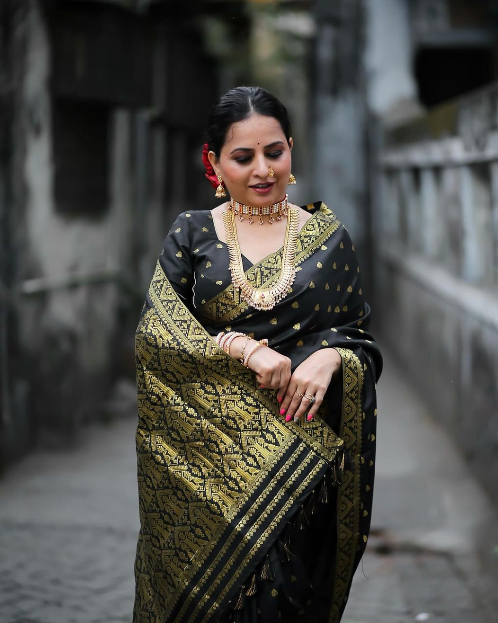 Step into timeless elegance with this Classic Black & Gold Banarasi Soft Silk Saree — a perfect blend of heritage and sophistication.