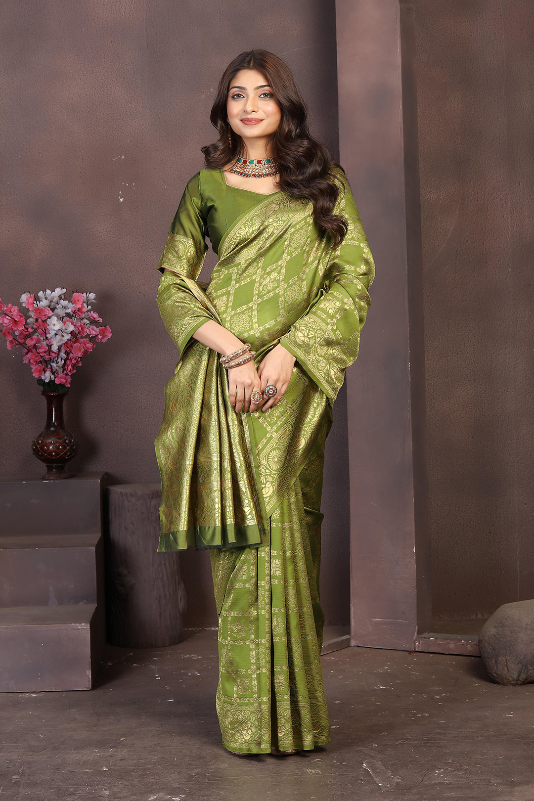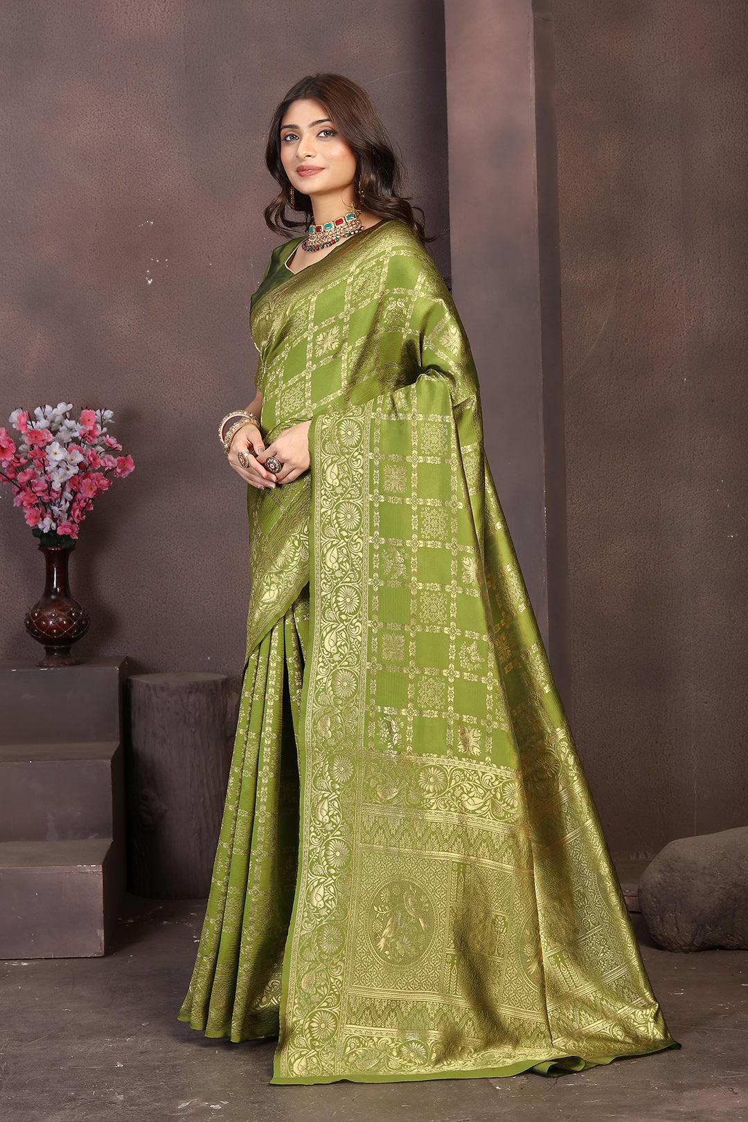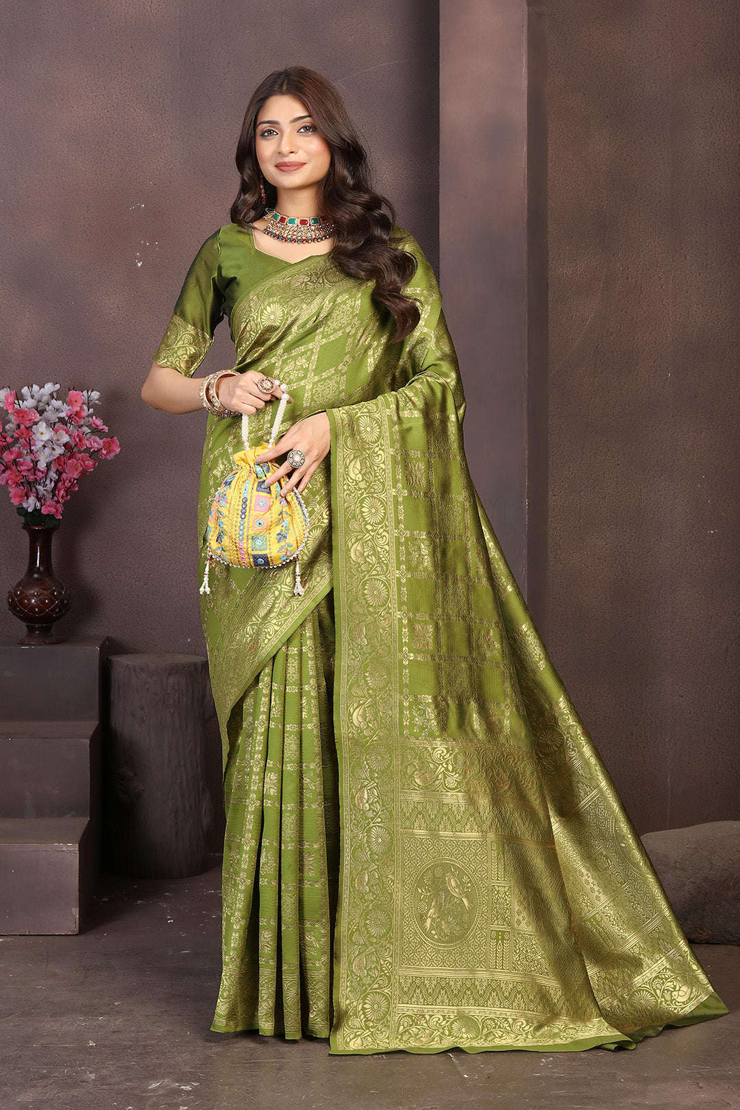 Style Tip: Pair this olive green Banarasi saree with antique gold jewelry, a statement potli bag, and soft curls for a graceful and festive look.