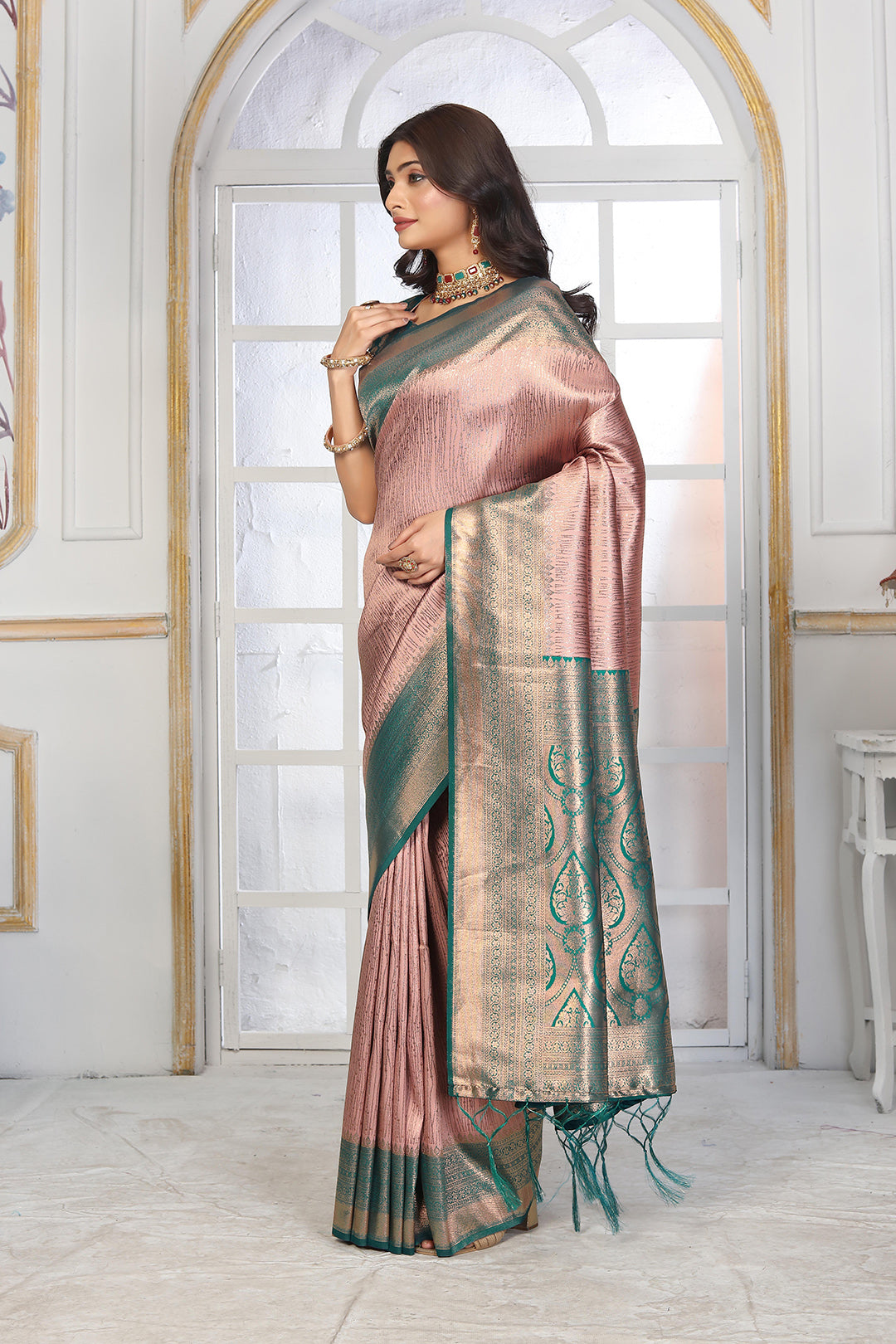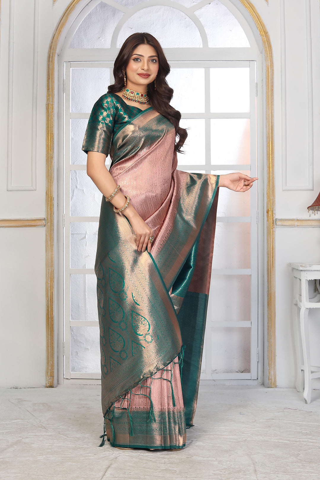 Elegant Rose Gold & Teal Jacquard Silk Saree with Intricate Zari Work