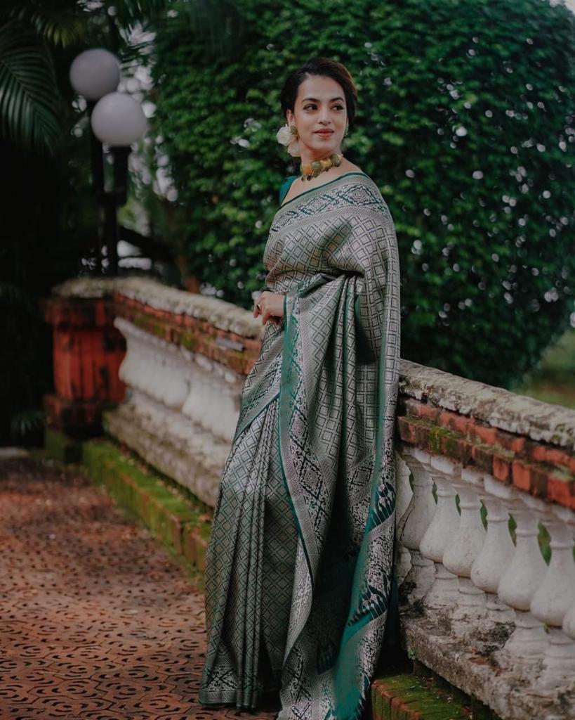 Featuring intricate silver zari weaving over a deep green silk base, it creates a mesmerizing contrast that shines with sophistication.