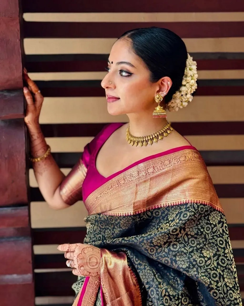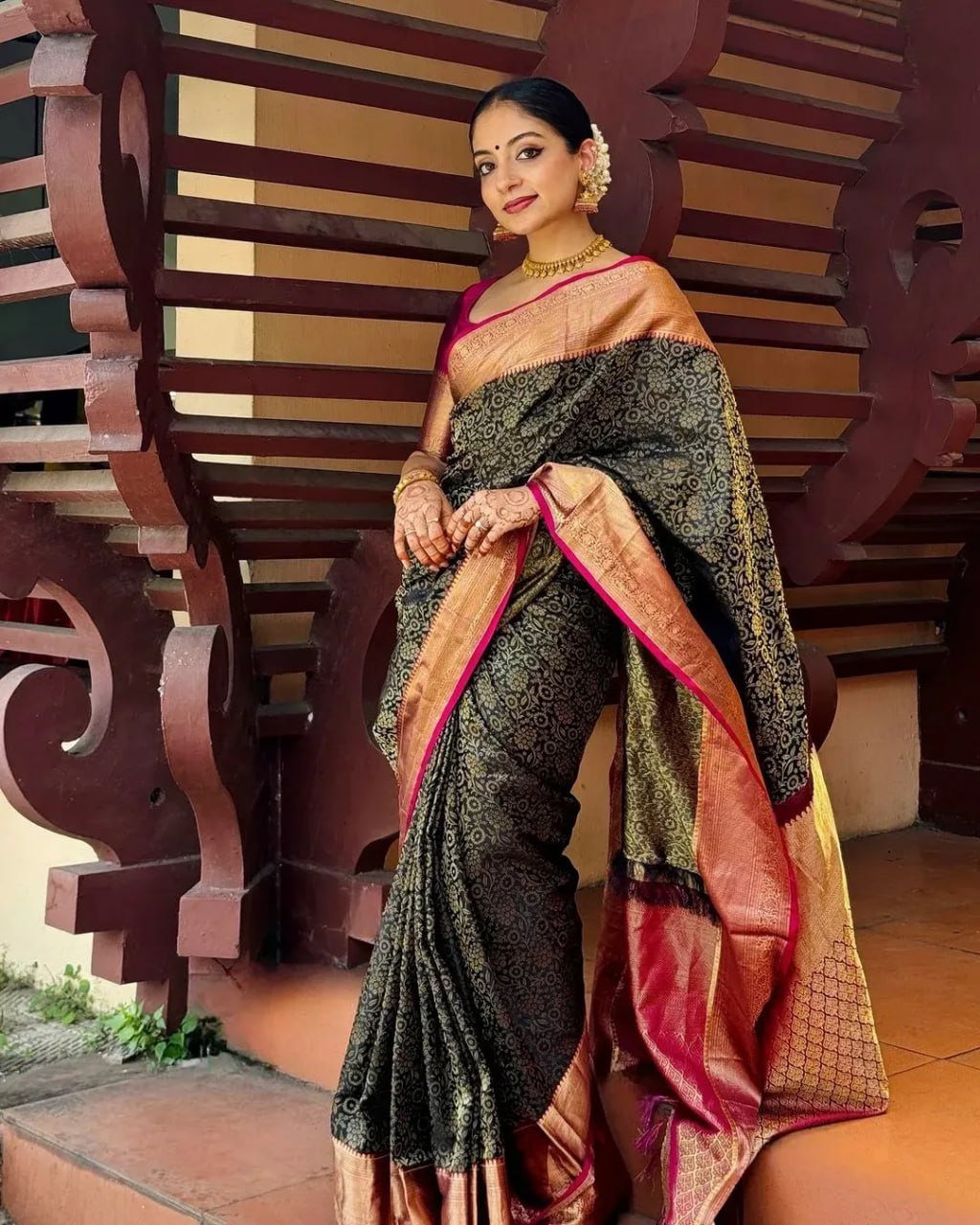 Its deep black base is beautifully adorned with intricate gold zari floral motifs and a rich copper border that radiates royal elegance.