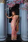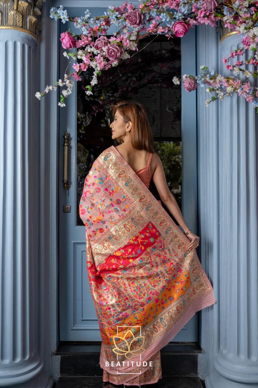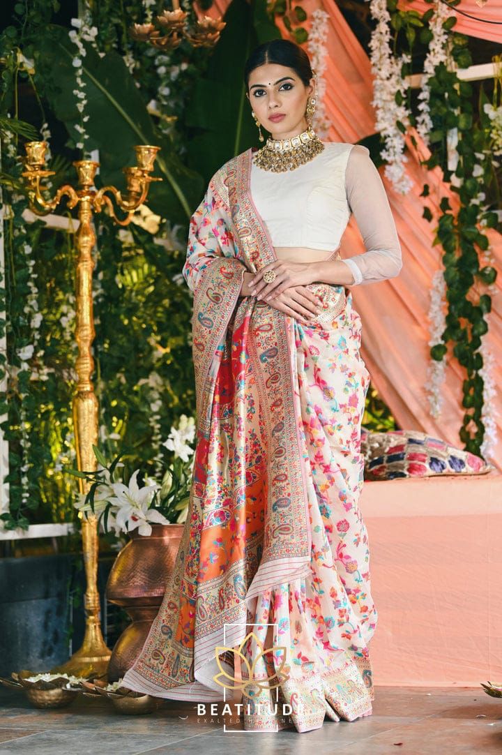 Step into elegance with this Floral Printed Banarasi Soft Silk Saree, showcasing delicate multicolor floral motifs on a cream base.