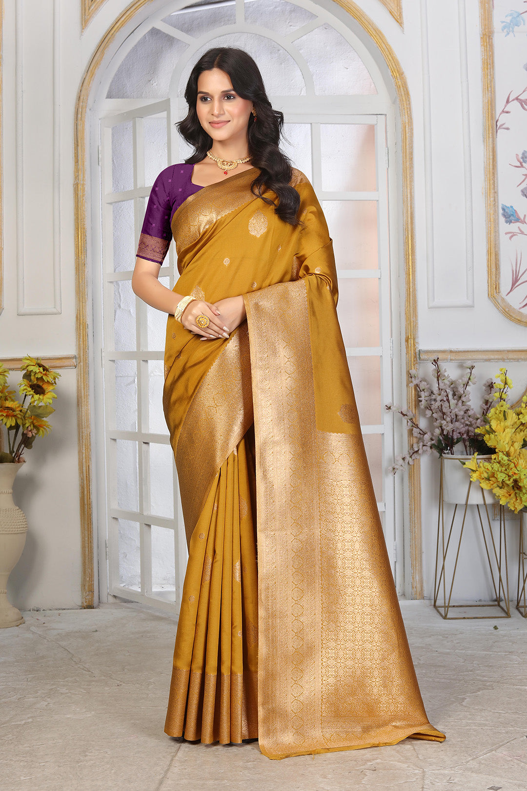 The vibrant golden mustard body pairs harmoniously with the deep purple blouse featuring delicate zari work on the sleeves, creating a refined and graceful ensemble. Ideal for weddings, festivals, and grand celebrations, this saree reflects tradition with a modern touch.