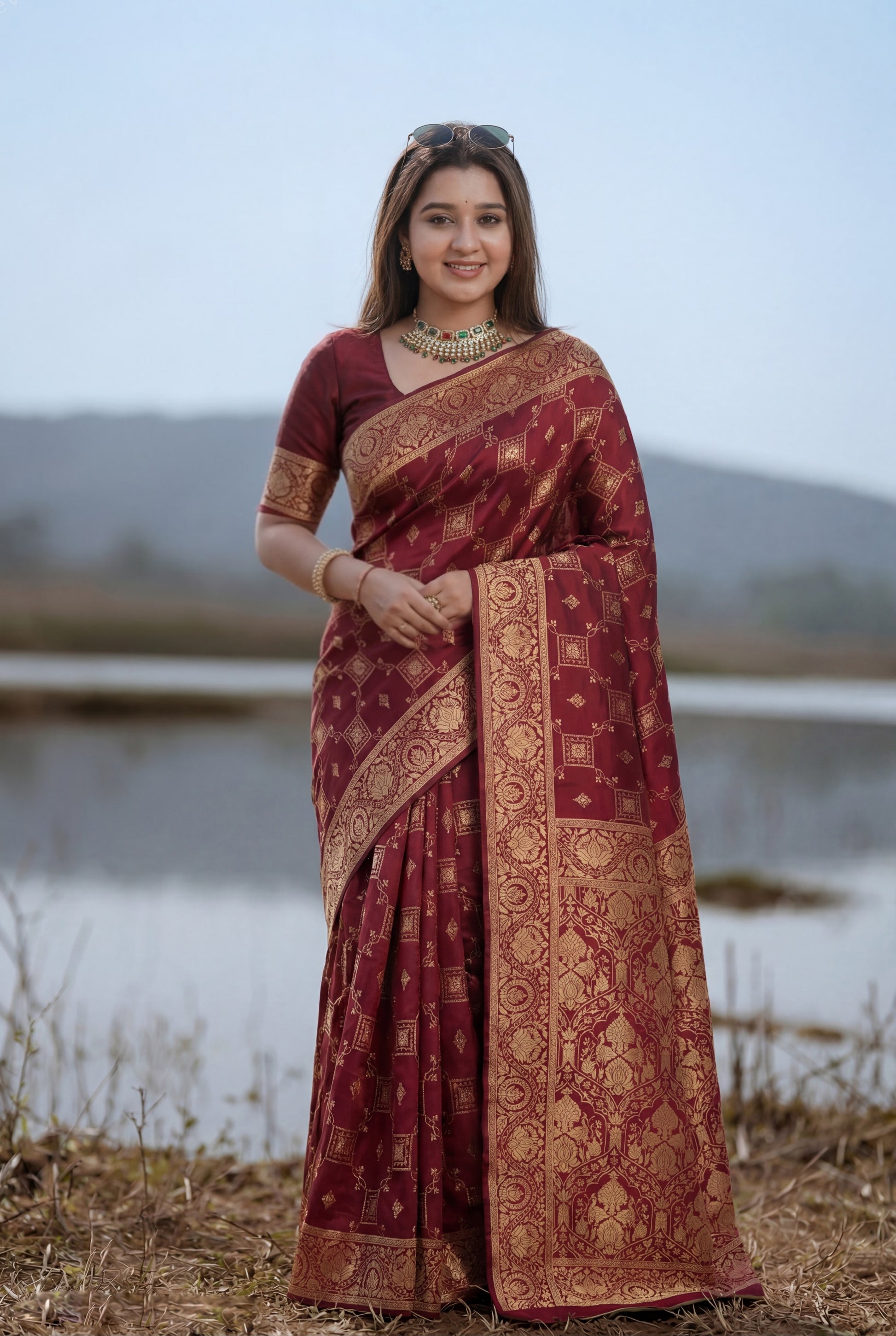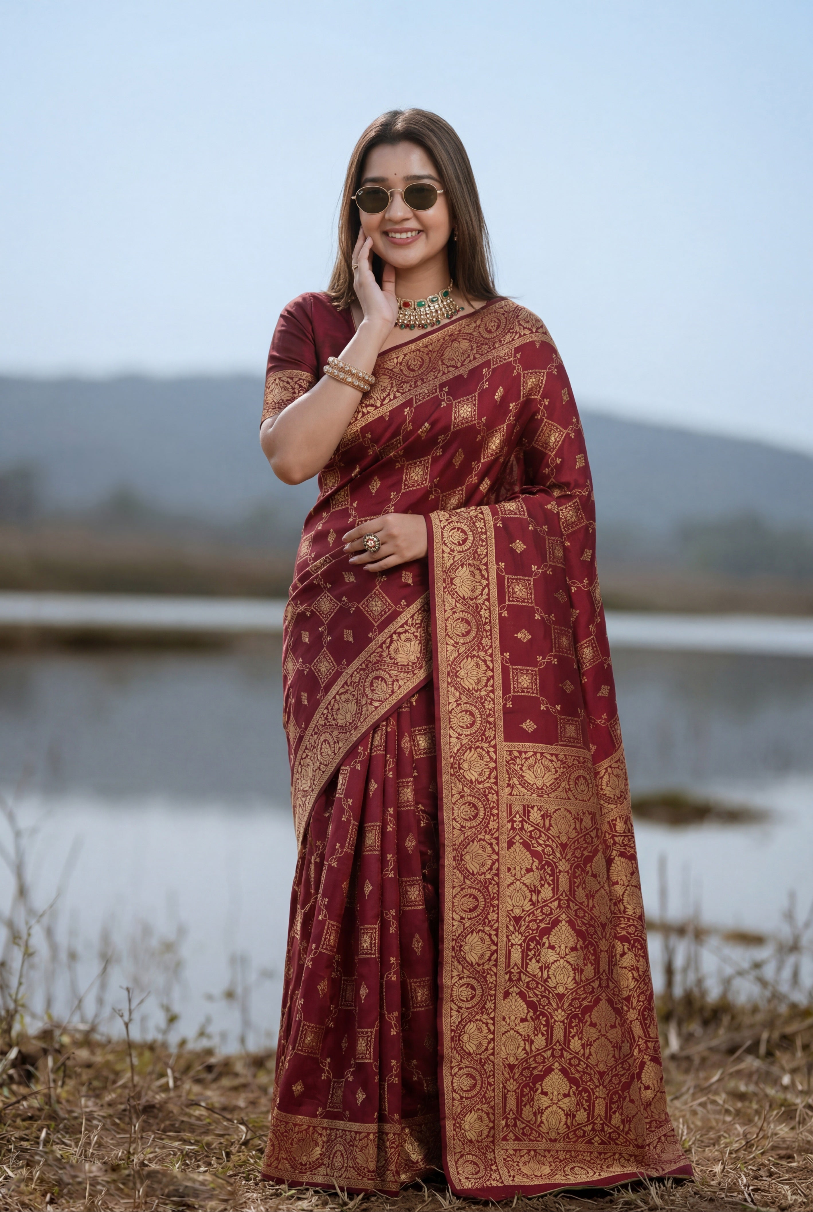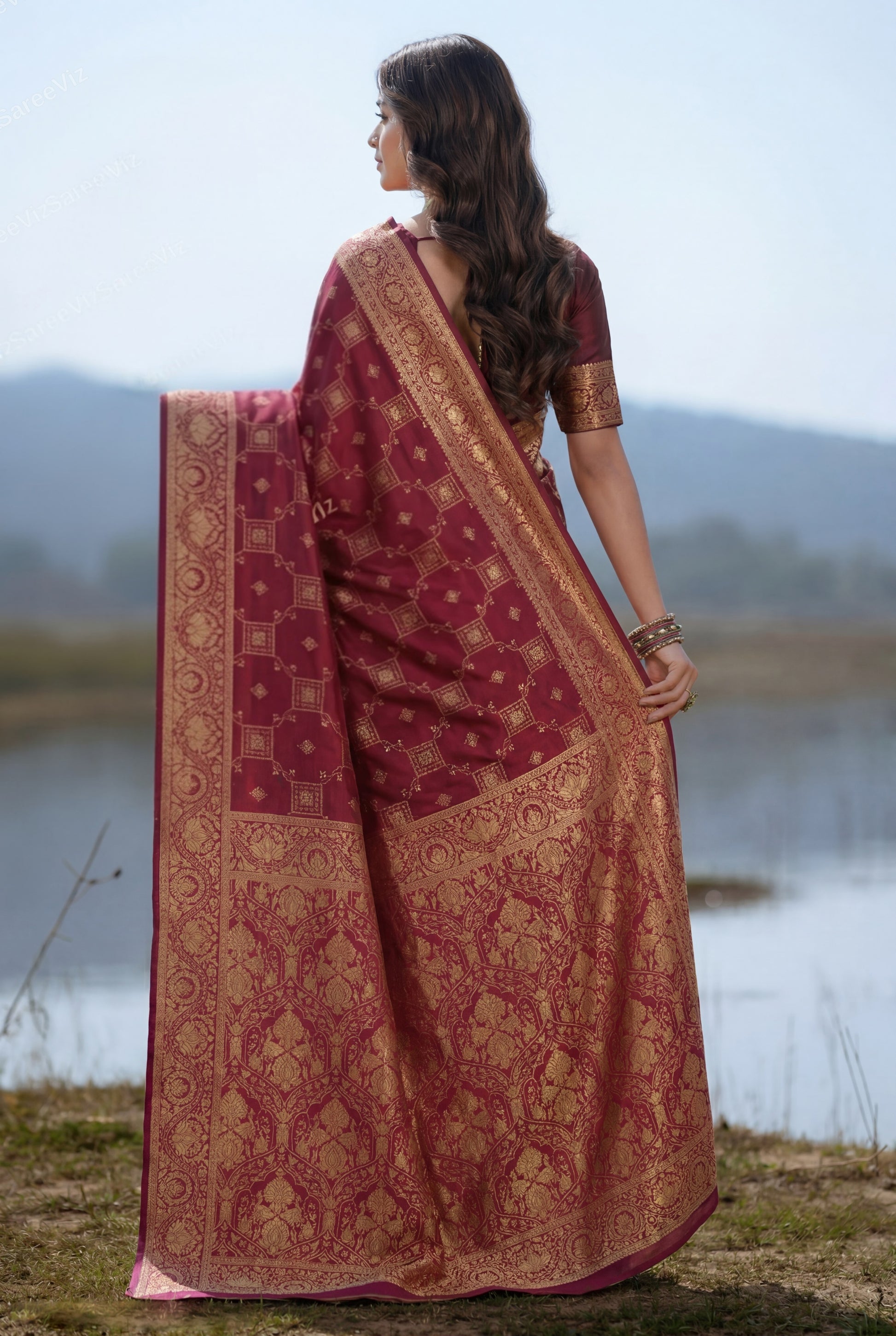 Maroon Banarasi Silk Saree with Intricate Golden Zari Work