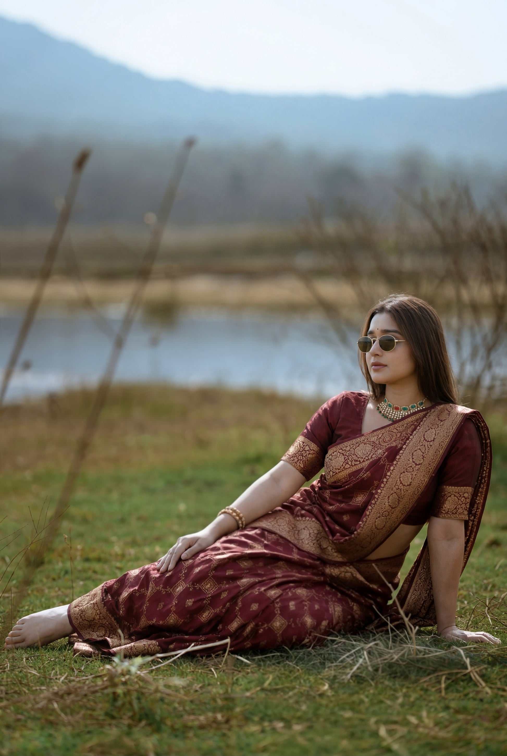 Style Tip: Pair this rich maroon Banarasi silk saree with Kundan jewelry, a sleek bun, and gold heels for a regal traditional look.