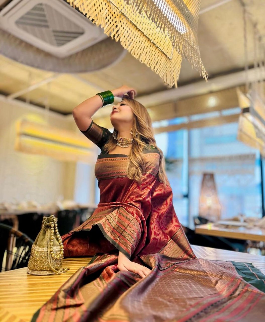 just purchased Royal Red Banarasi Soft Silk Saree with Antique Zari Weaving and Contrast Green Blouse