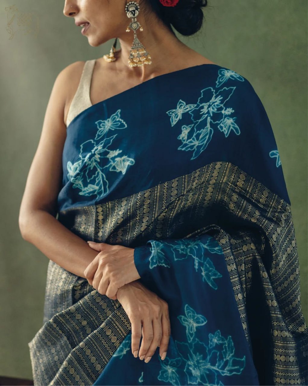 This elegant Navy Blue Banarasi Soft Silk Saree is a blend of modern minimalism and traditional craftsmanship.