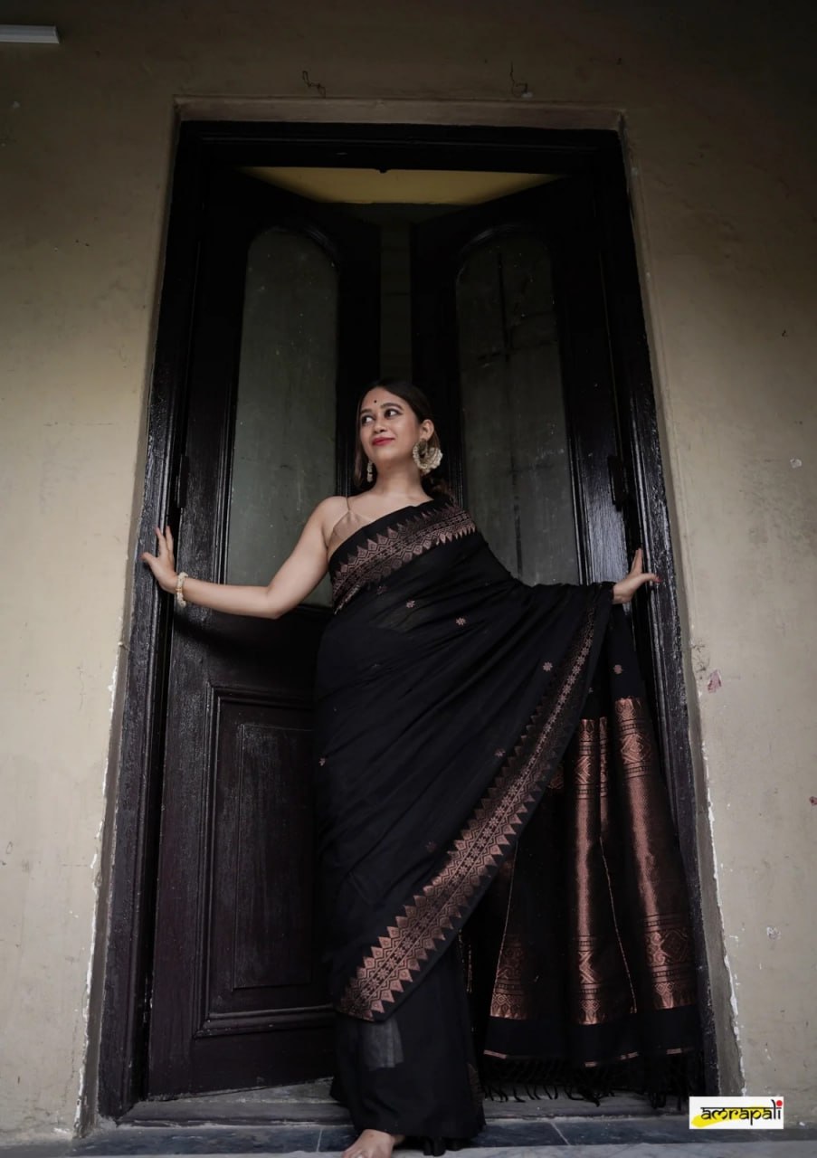 Command attention with the timeless charm of this Noir Royal Banarasi Silk Saree. Woven in luxurious soft silk, this saree captures elegance through its deep black hue accentuated by intricate antique copper zari motifs scattered across the drape. The geometric patterned border and pallu add a regal touch, making it a perfect ensemble for festive nights, traditional gatherings, or elegant evening occasions. Designed for the woman who values sophistication and heritage in every weave.