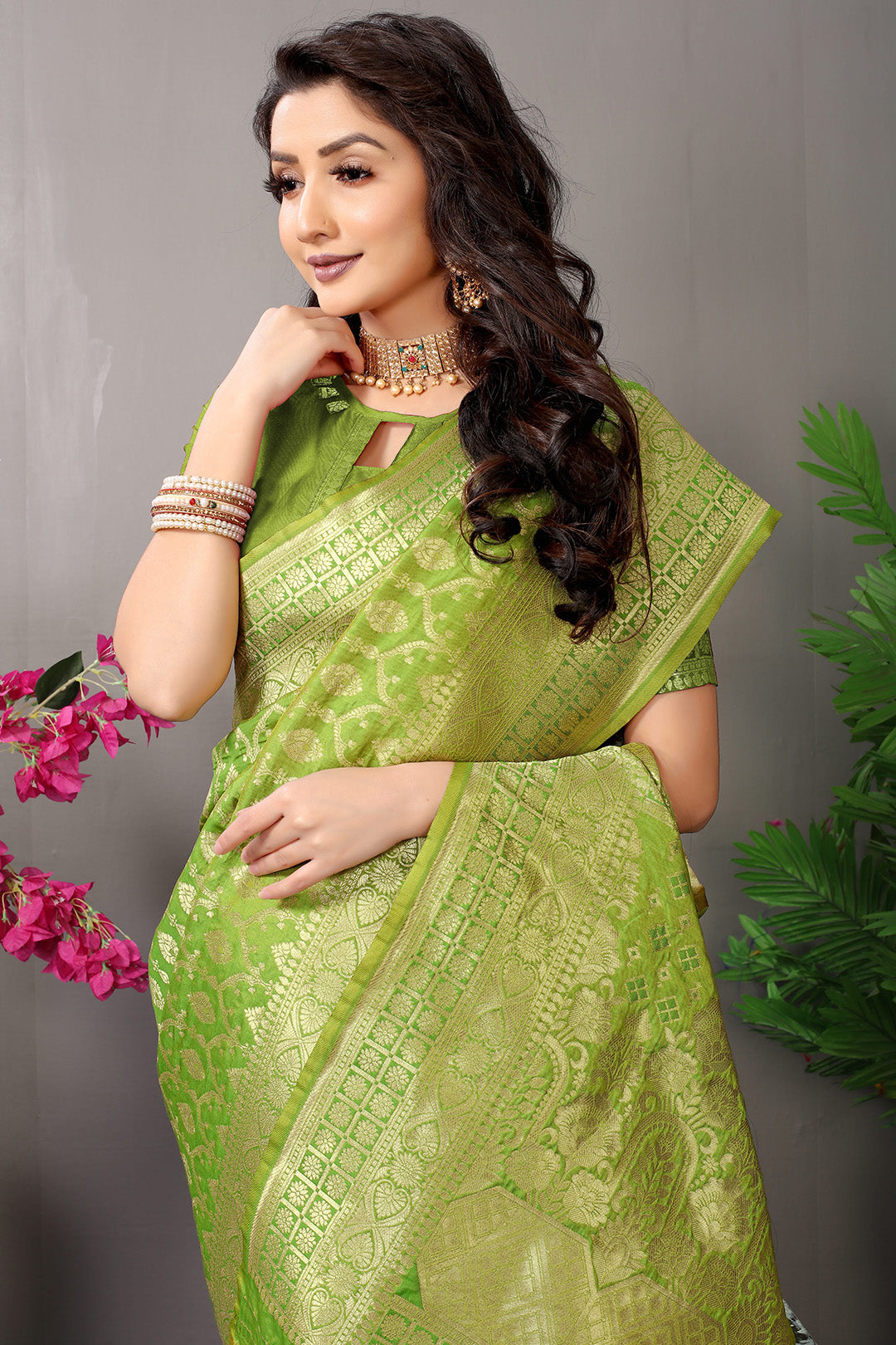 Parrot Elegance: Leaf Green Banarasi Silk Saree with Grand Gold Zari Work
