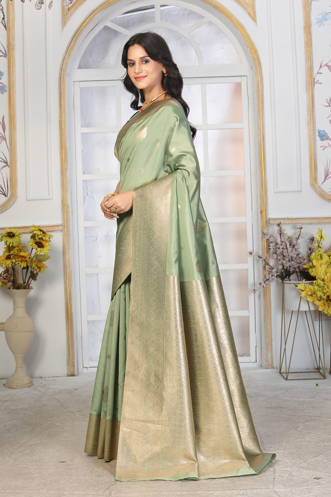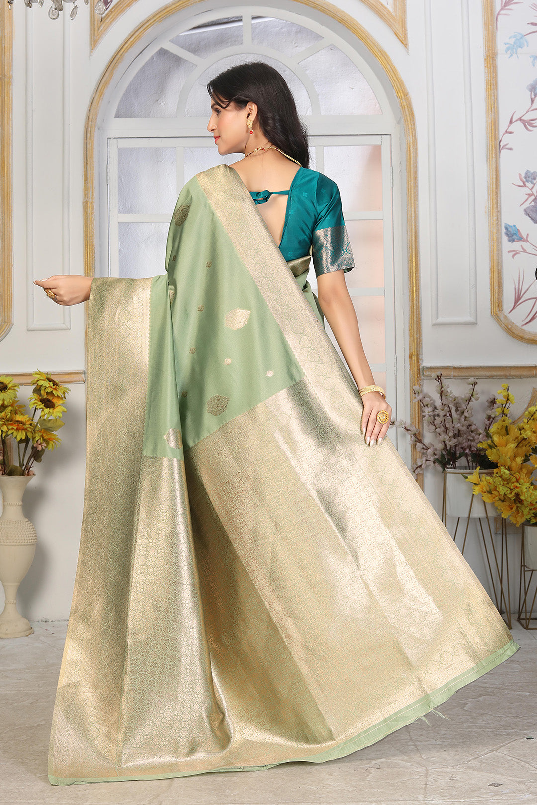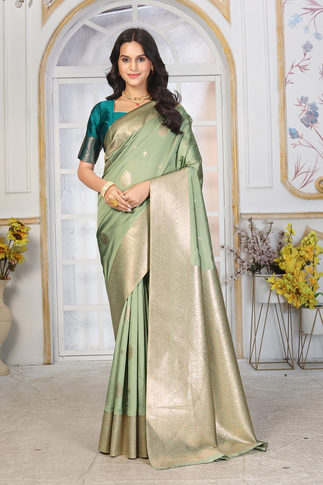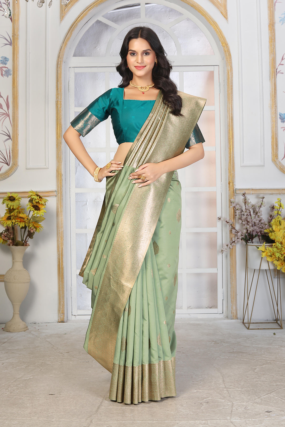 Pastel Pistachio Green Jacquard Silk Saree with Gold Zari & Teal Contrast Blouse