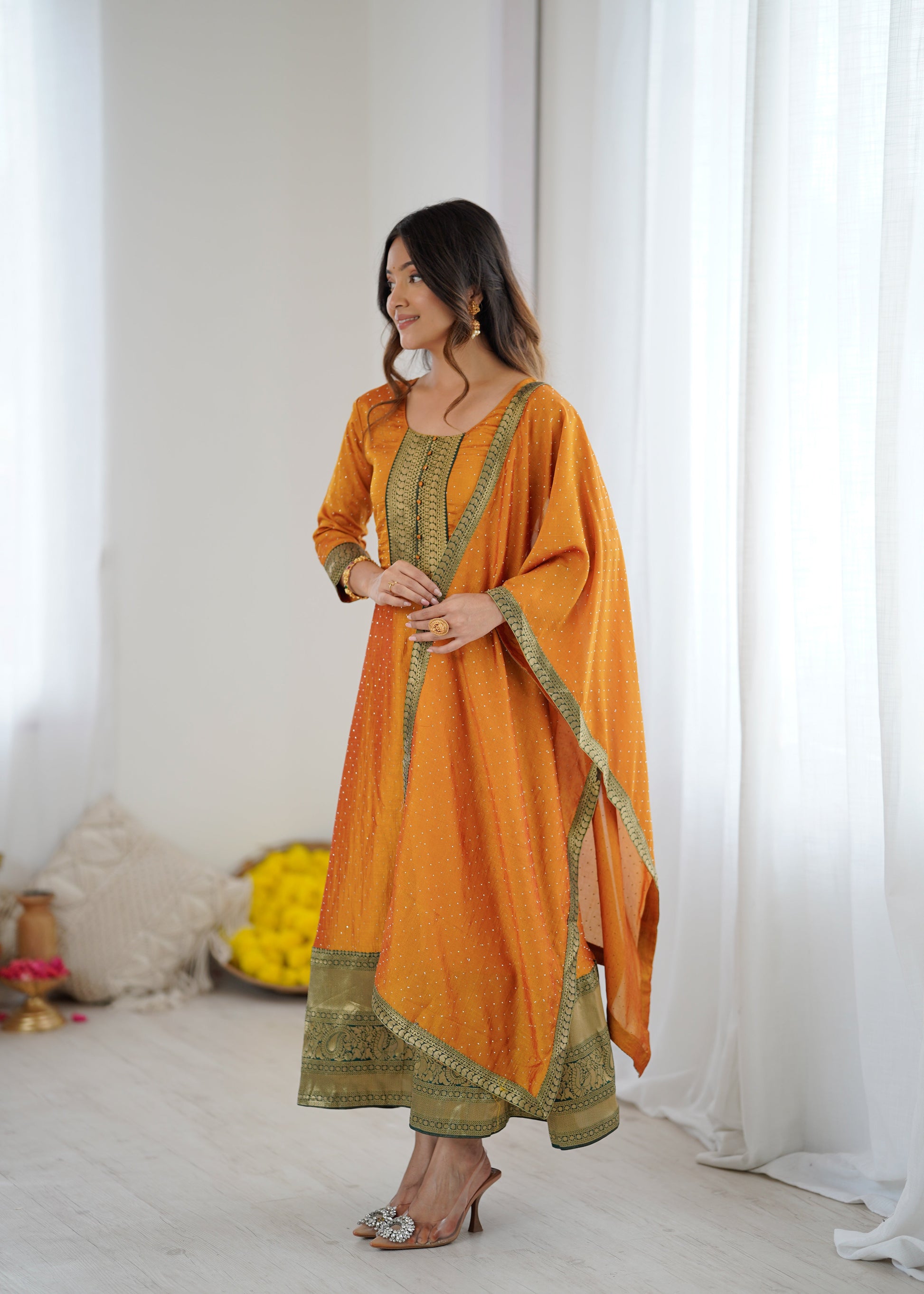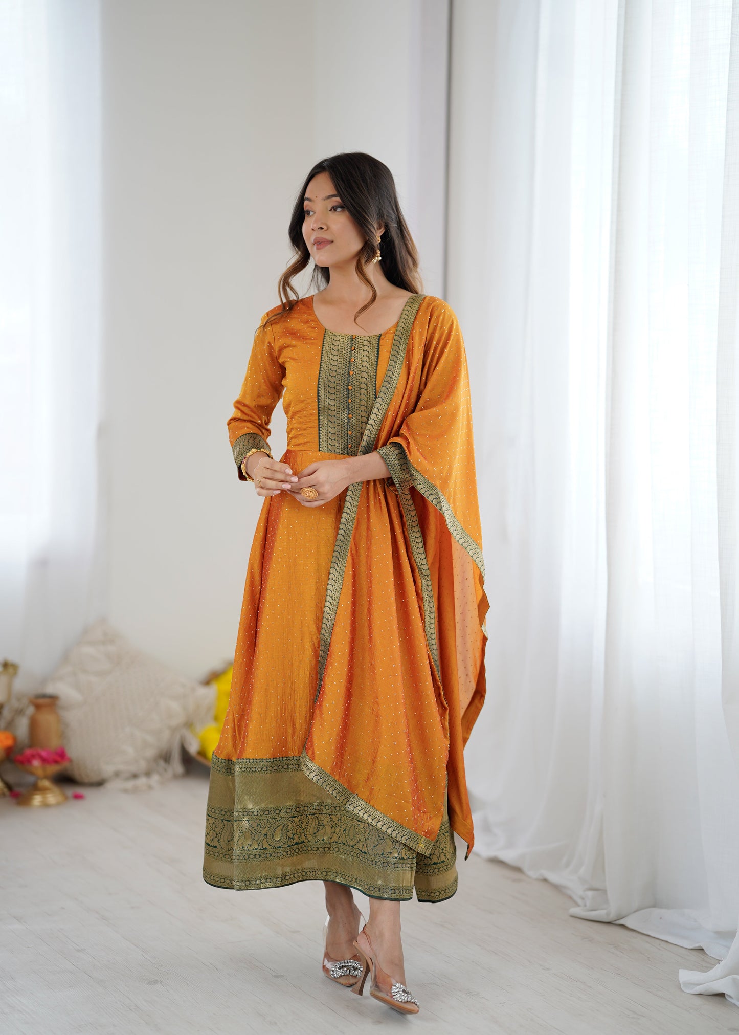 Premium Quality Yellow Bluming Vichitra fabric with Jacquard Weaving Lace Border Duptta Gown