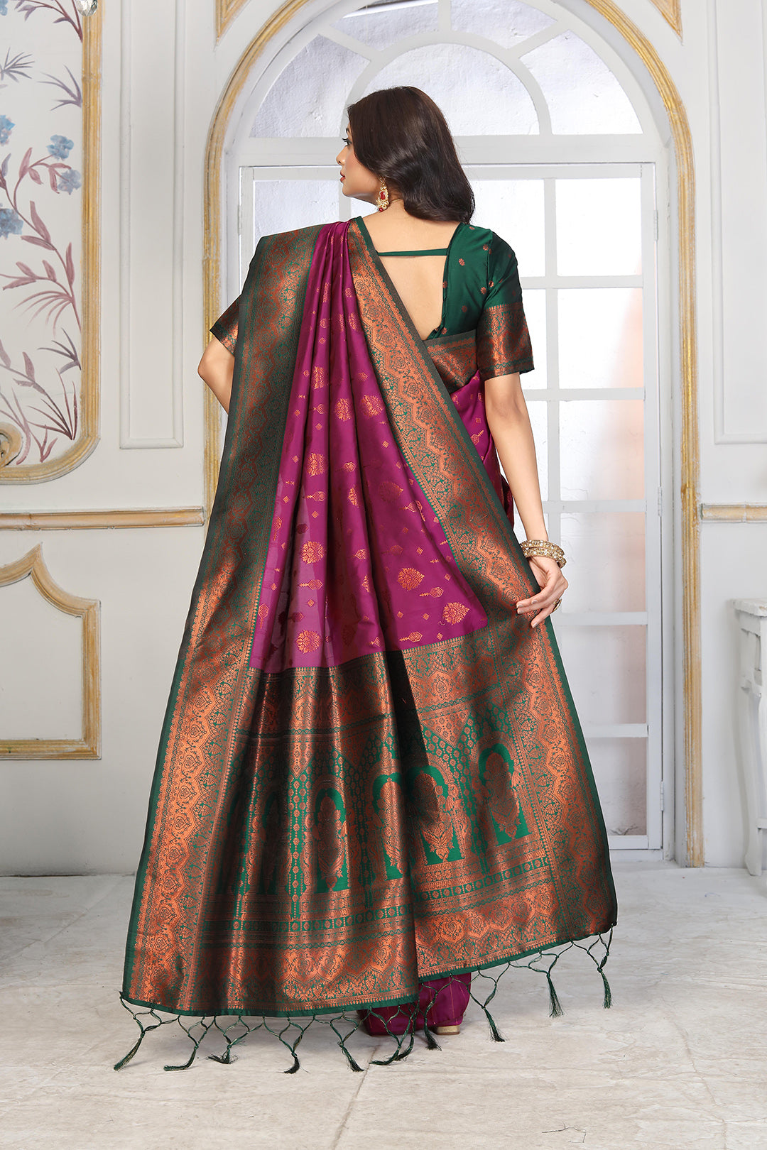 just purchased Regal Purple Jacquard Silk Saree with Heritage Temple Zari Pallu & Bottle Green Contrast Blouse
