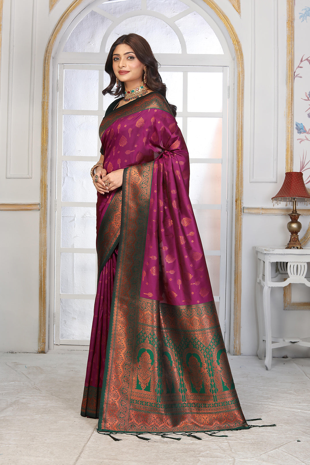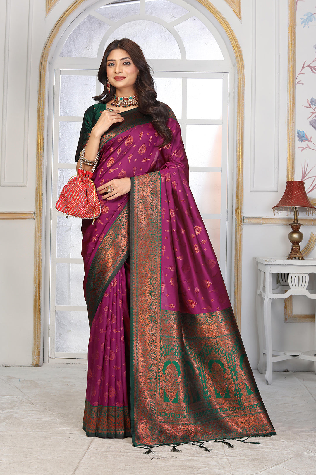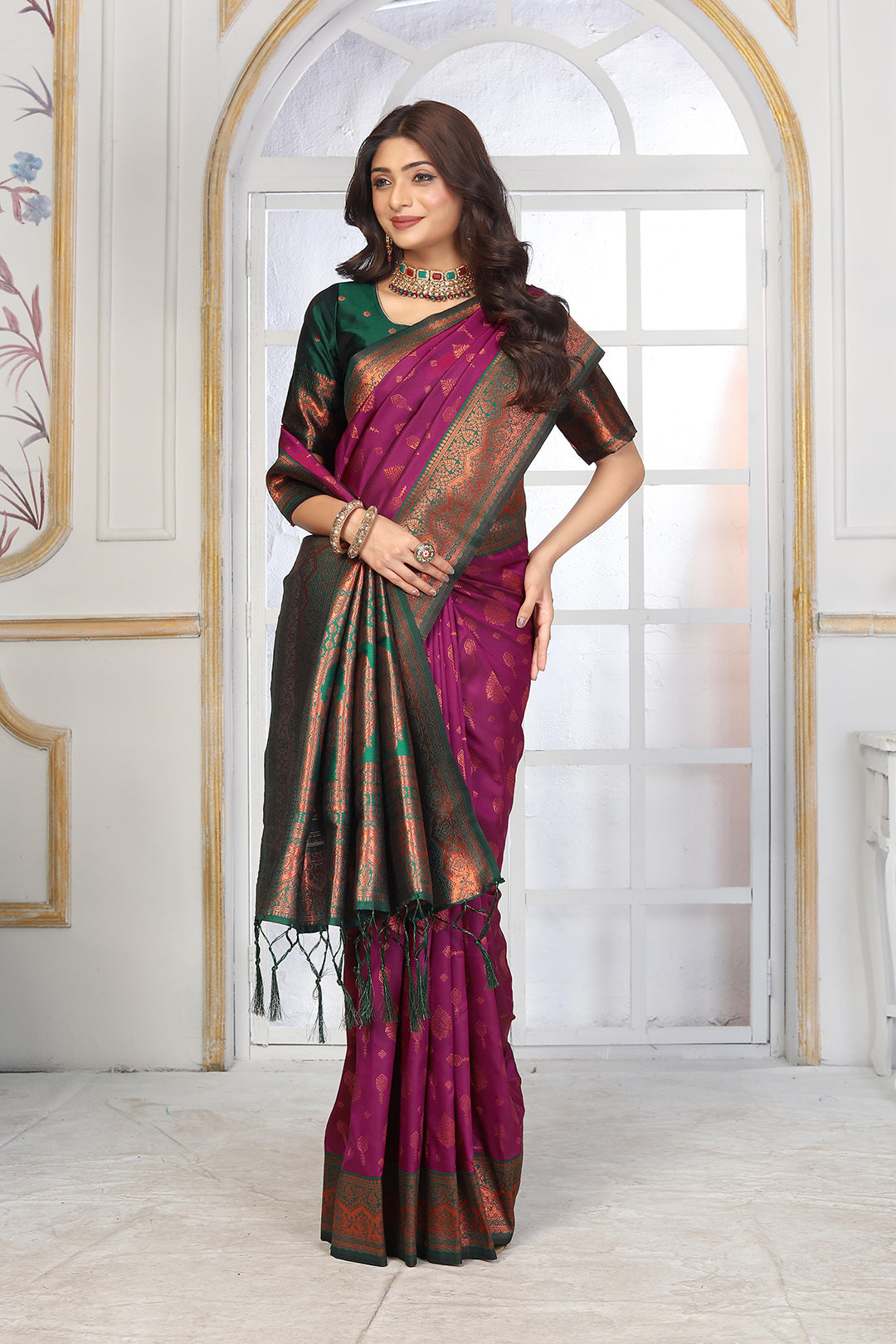 Regal Purple Jacquard Silk Saree with Heritage Temple Zari Pallu & Bottle Green Contrast Blouse
