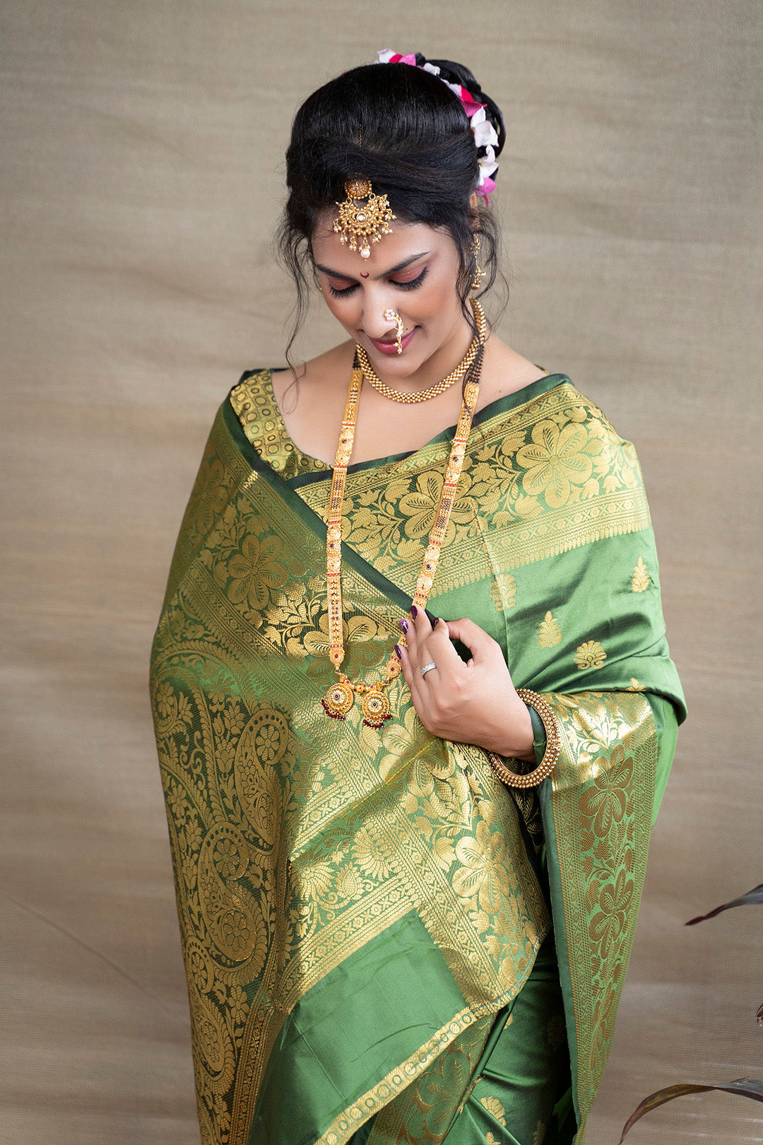 Style Tip: Complement the earthy richness of this saree with antique gold jewelry and a traditional braid or bun adorned with jasmine flowers. A bold green bindi and kohl-lined eyes will accentuate your ethnic look, while soft peach lips will balance the vibrance of the ensemble.