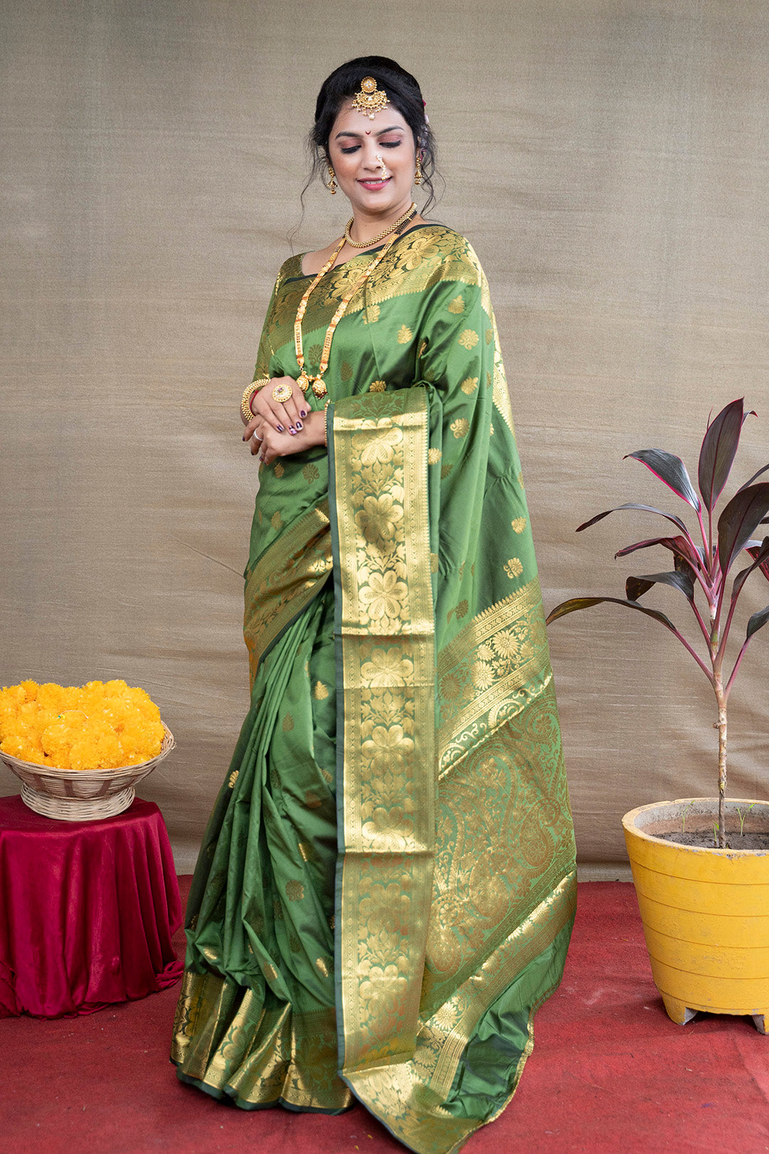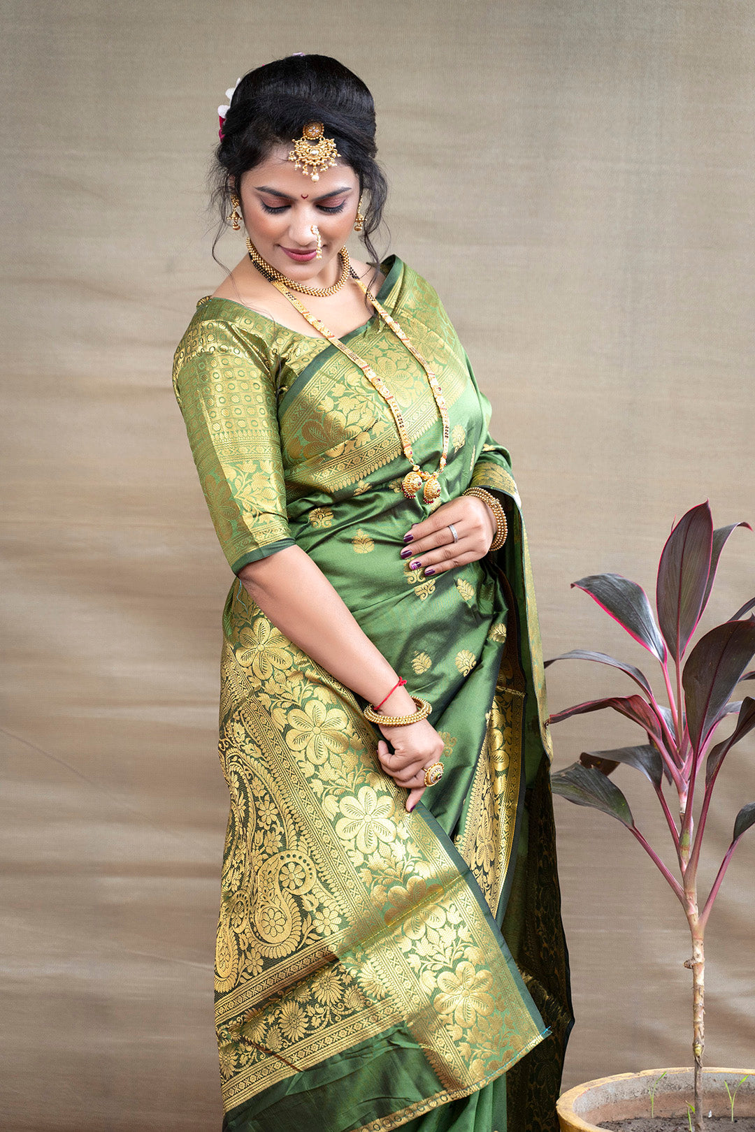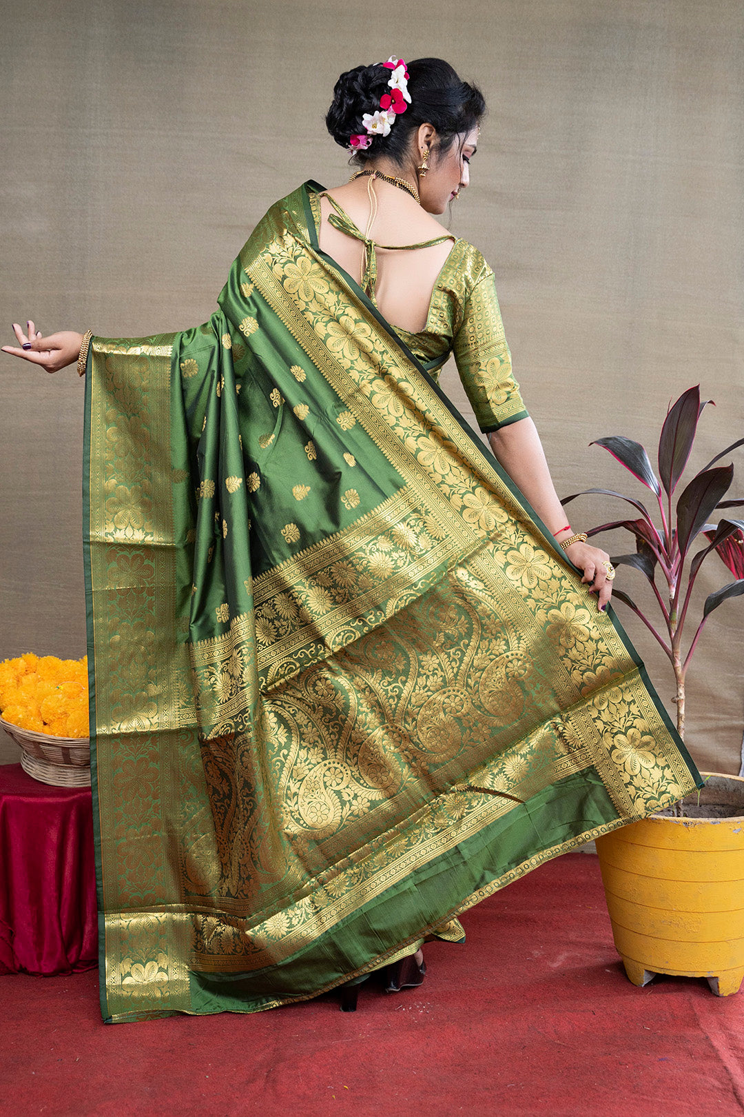 Royal Olive Green Banarasi Jacquard Saree with Luxurious Gold Zari Detailing