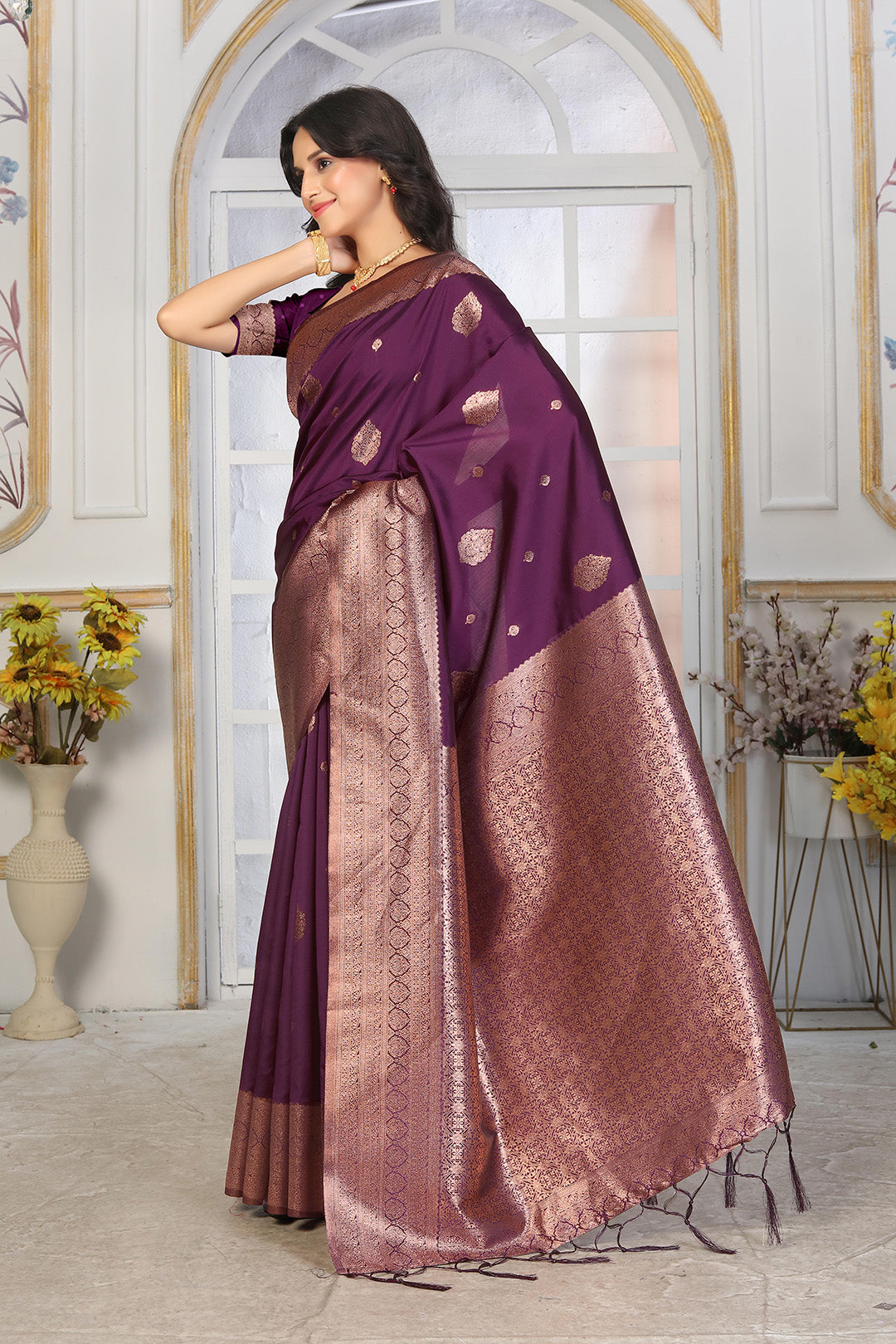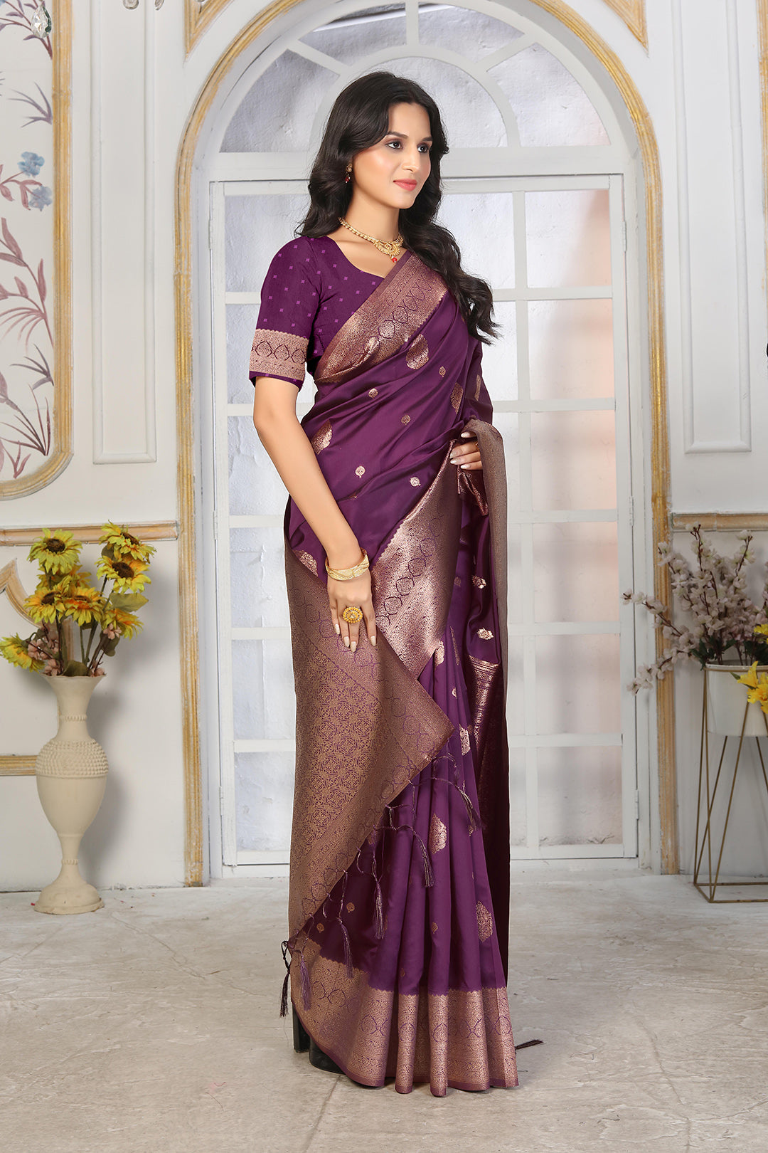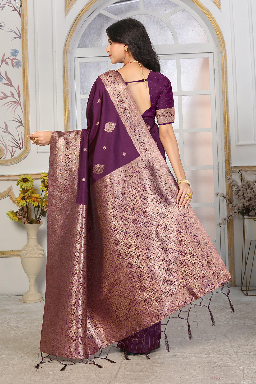 Royal Plum Purple Jacquard Silk Saree with Antique Rose Gold Zari Weaving