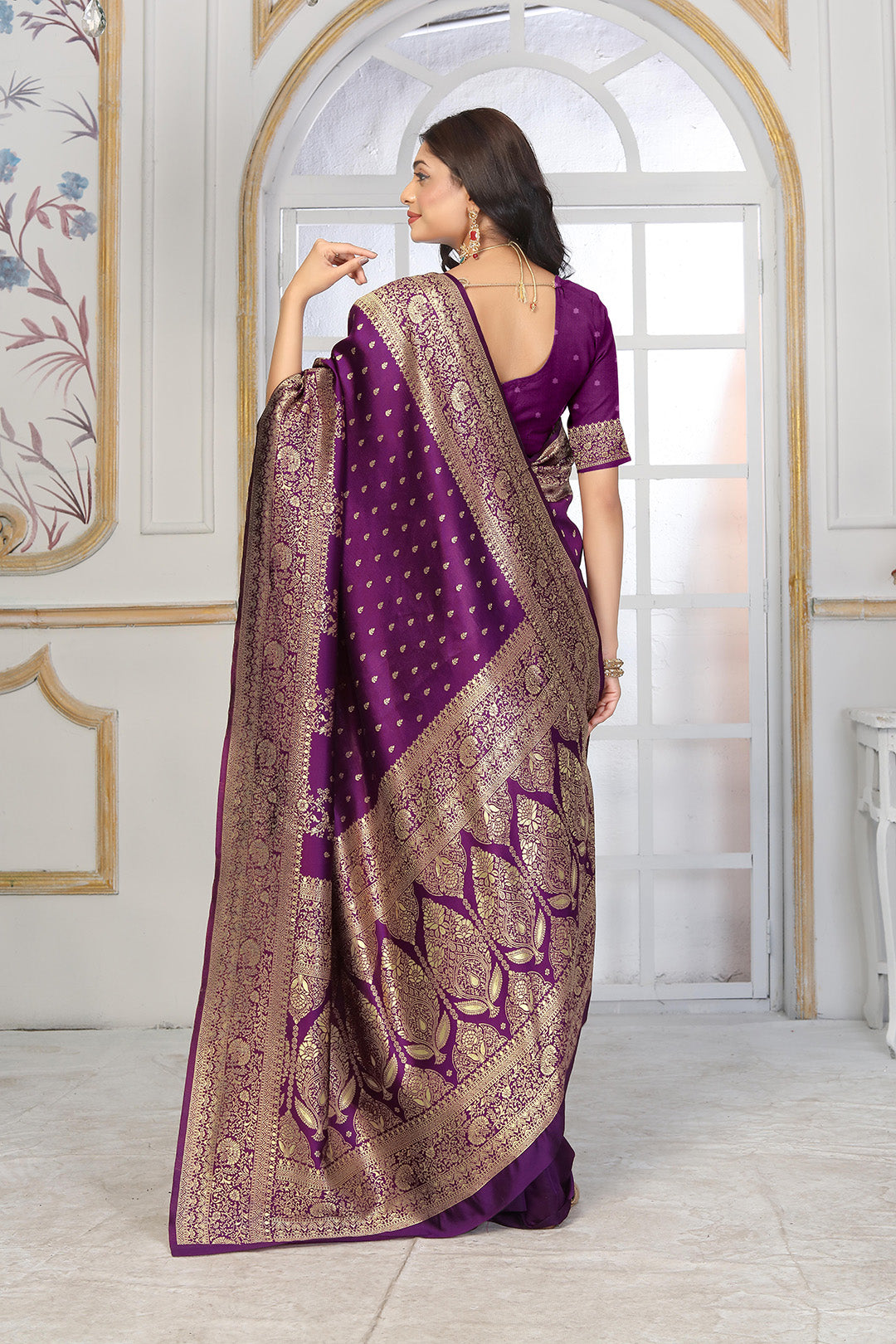 Style Tip: Pair this regal Banarasi silk saree with a statement choker necklace and matching jhumkas to enhance the traditional charm. Opt for soft, wavy hair and a bold bindi to complete the classic Indian look. For a touch of elegance, wear gold or embellished heels and carry a matching potli bag or clutch. Keep your makeup dewy with a hint of highlighter and a deep berry or red lipstick to complement the rich purple tones.