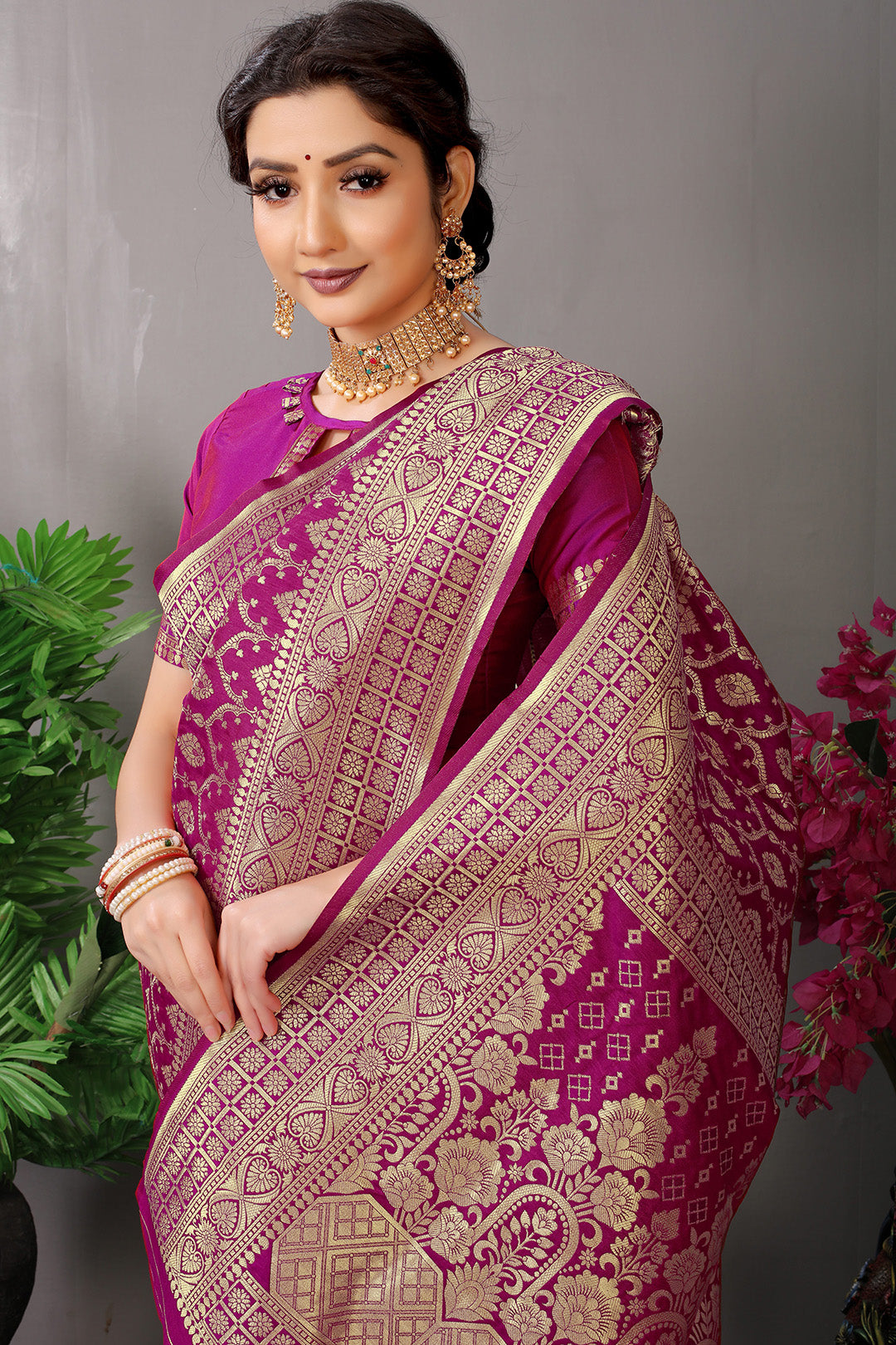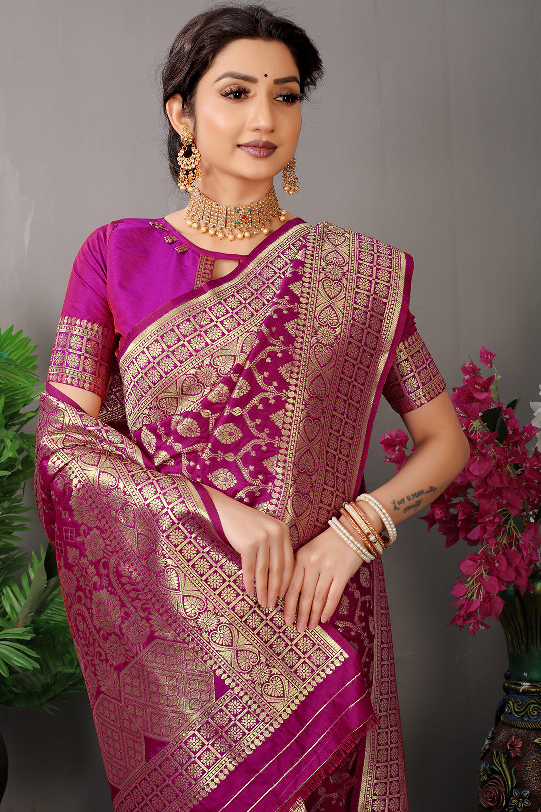 Style Tip: Enhance the regal charm of this magenta Banarasi saree by pairing it with a high-neck blouse in deep gold or contrasting emerald green. Opt for heavy Kundan or Polki jewelry think a choker necklace with matching jhumkas and bangles. A sleek low bun adorned with fresh jasmine flowers will add a classic touch, while a bold bindi and deep-toned lipstick complete the traditional, graceful look. Perfect for weddings and grand festive occasions.