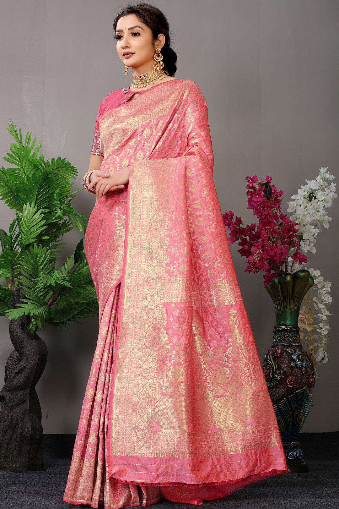 Soft Pink Banarasi Silk Saree with Delicate Gold Zari Brocade Weaving