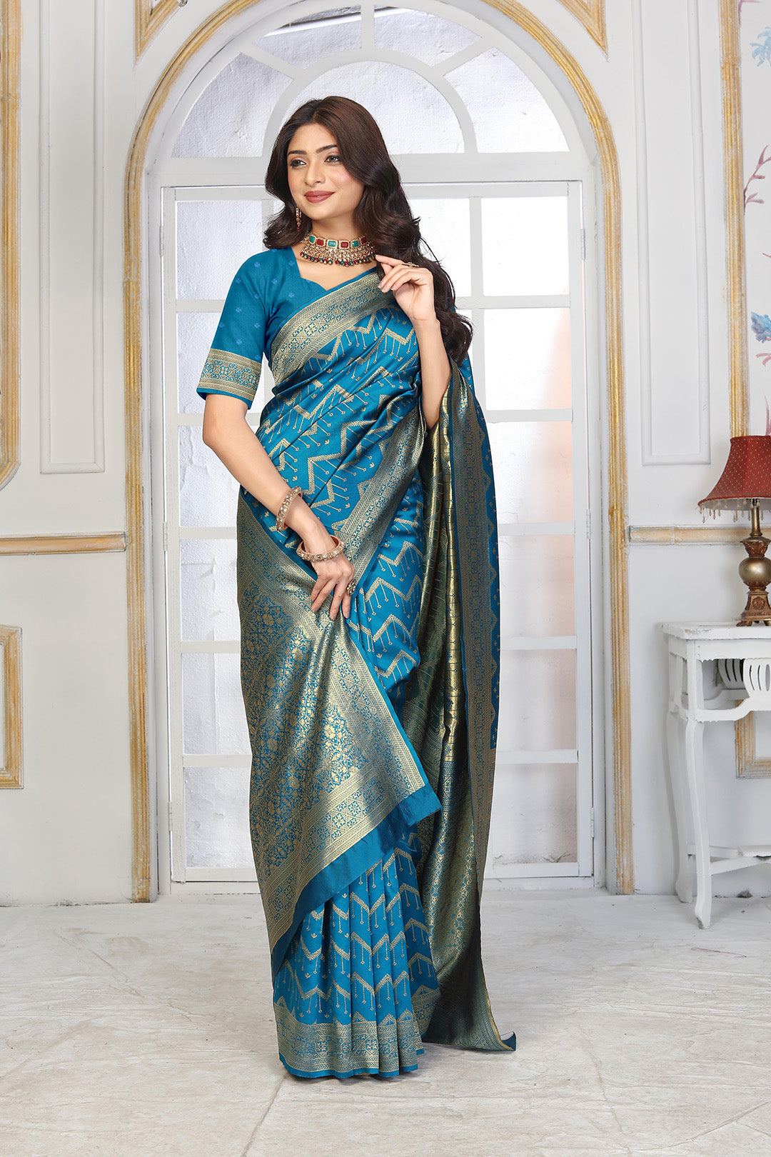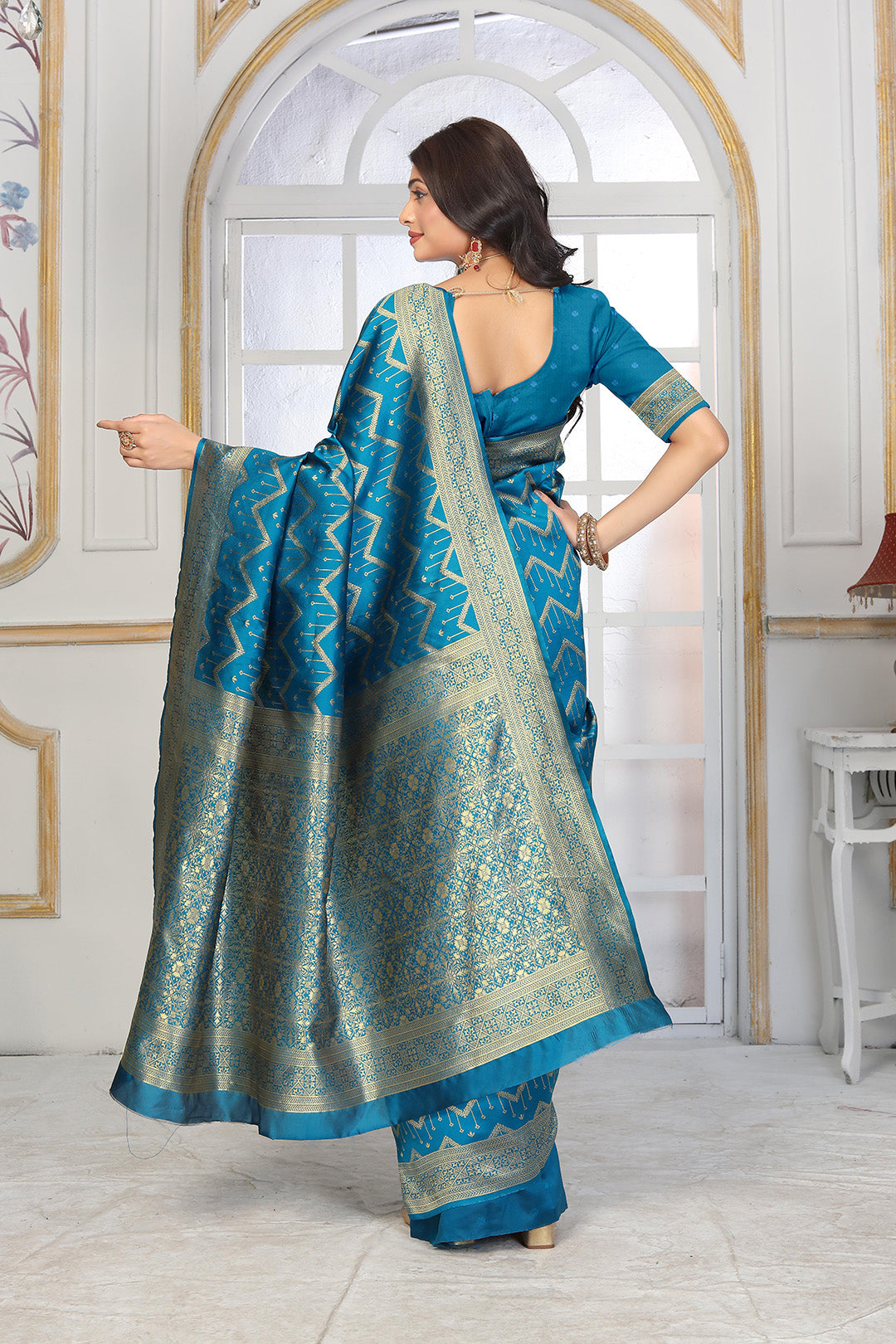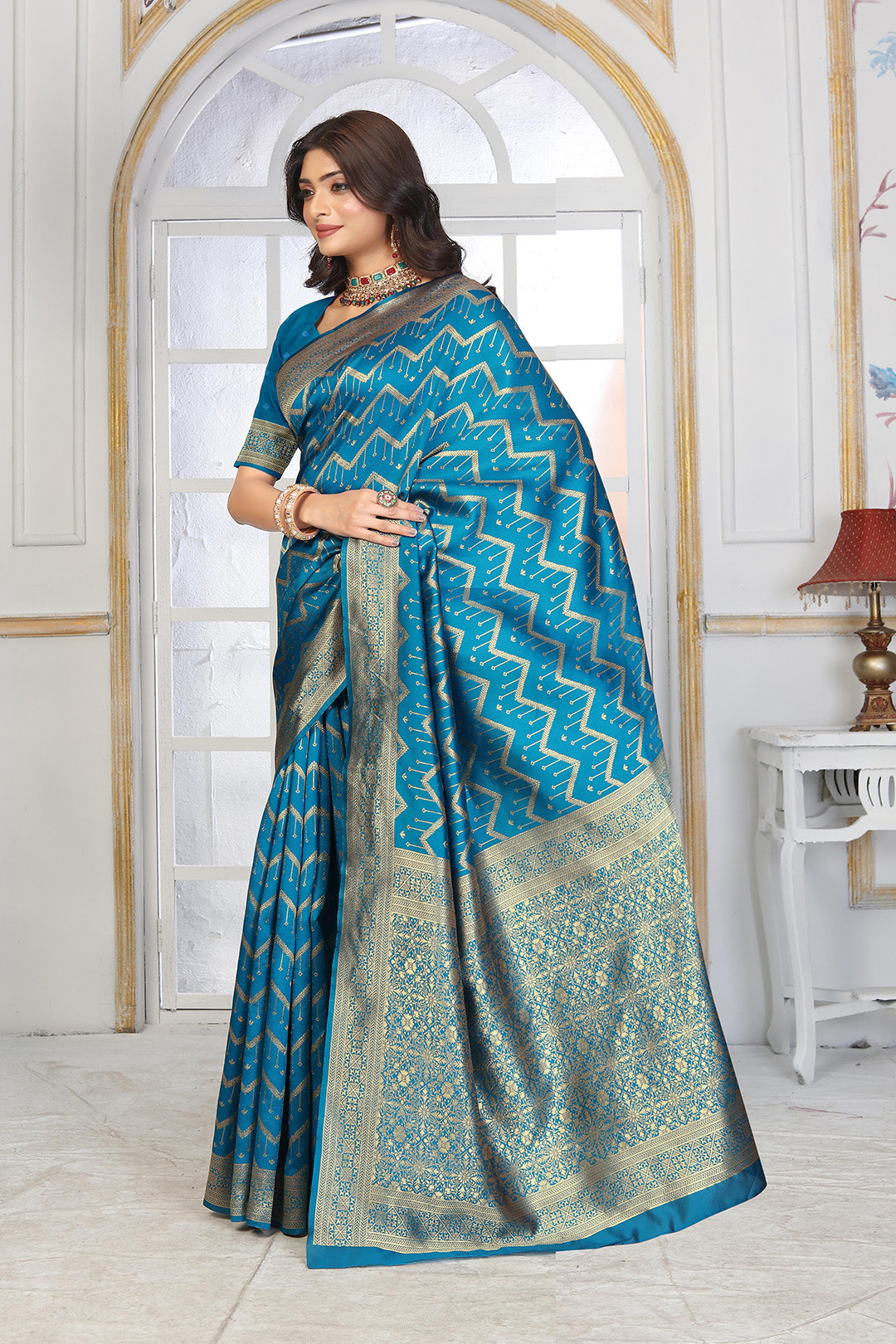 Teal Blue Banarasi Silk Saree with Geometric Zari Weaving and Rich Floral Pallu