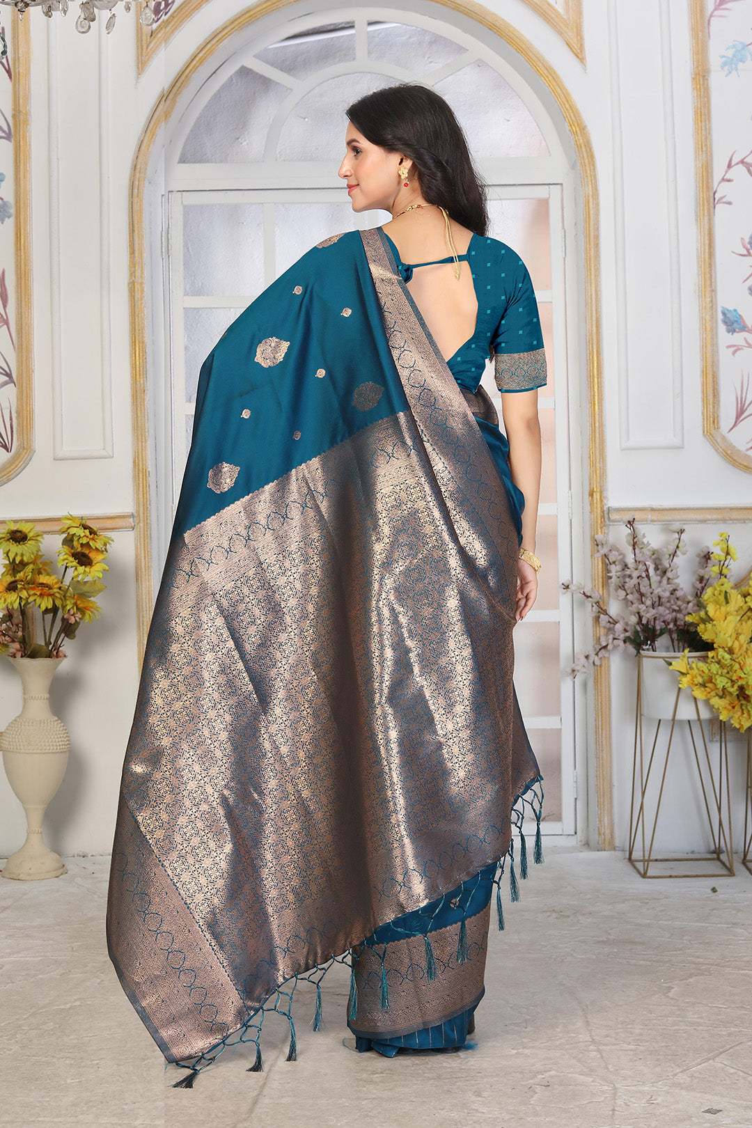 Teal Blue Jacquard Silk Saree with Antique Silver Zari and Minimalist Butta Work