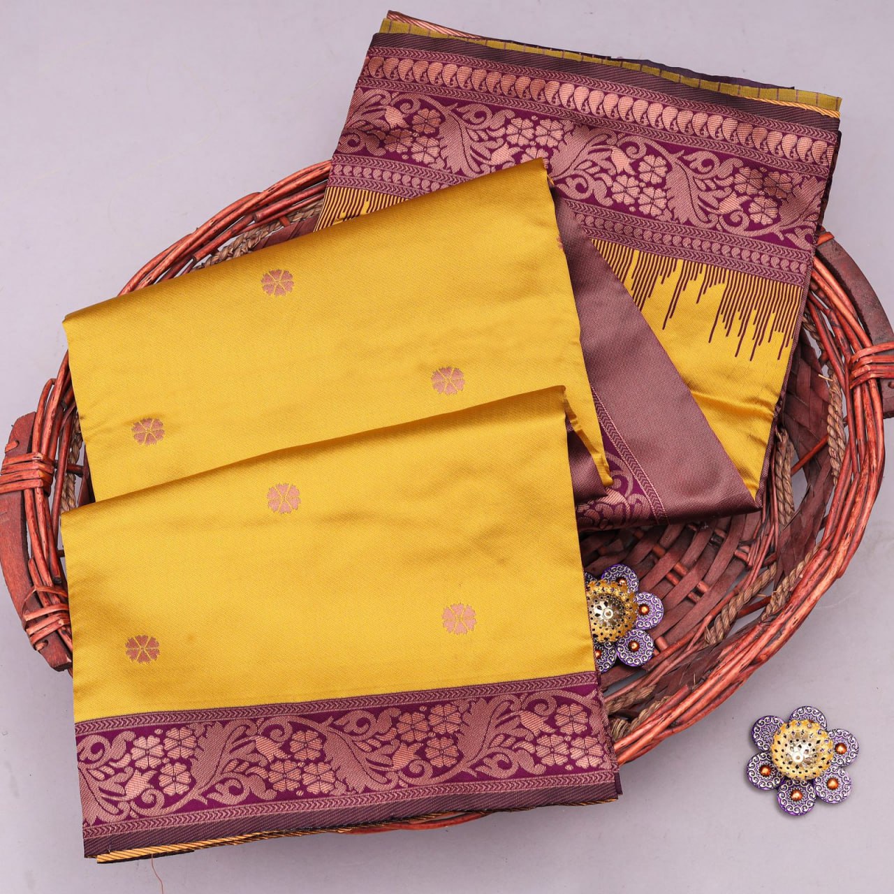 Yellow Banarasi Silk Saree with Purple Zari Border
